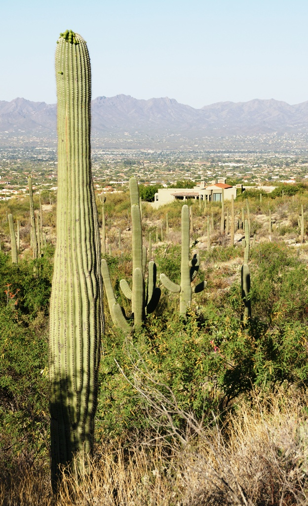 Here is a portion of the saguaro forest, around 7 am with the lower canyon filled with light. There are a few foothill homes with west and southwest Tucson. The Tucson Mountains are in the distance.