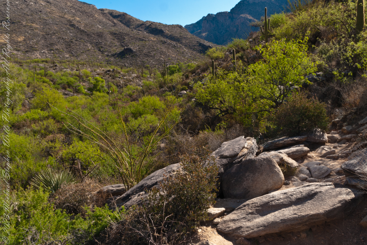 Pima Canyon is the next over, behind that near ridge which provides similar shade. Unlike Finger Rock Canyon, the Pima Canyon trail follows the western cliff and loses the shade much sooner. During our three-week trip, my wife, Pam, and I visited Pima in our first week.