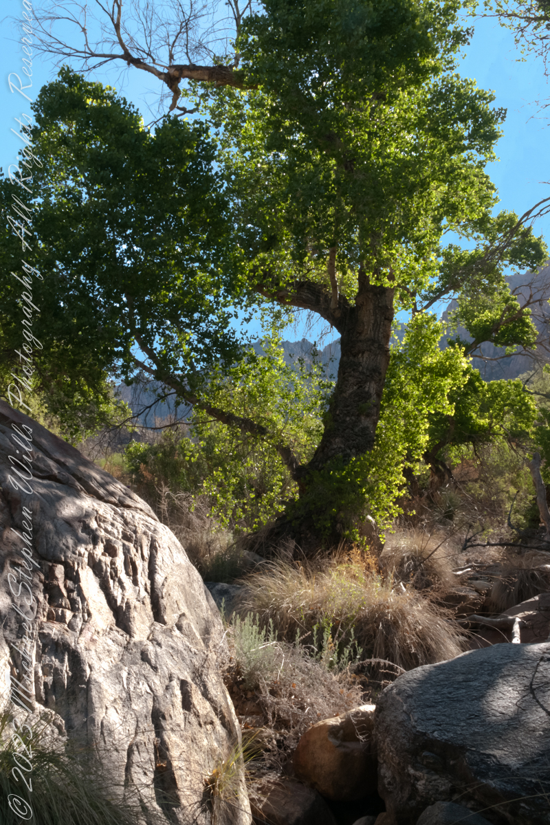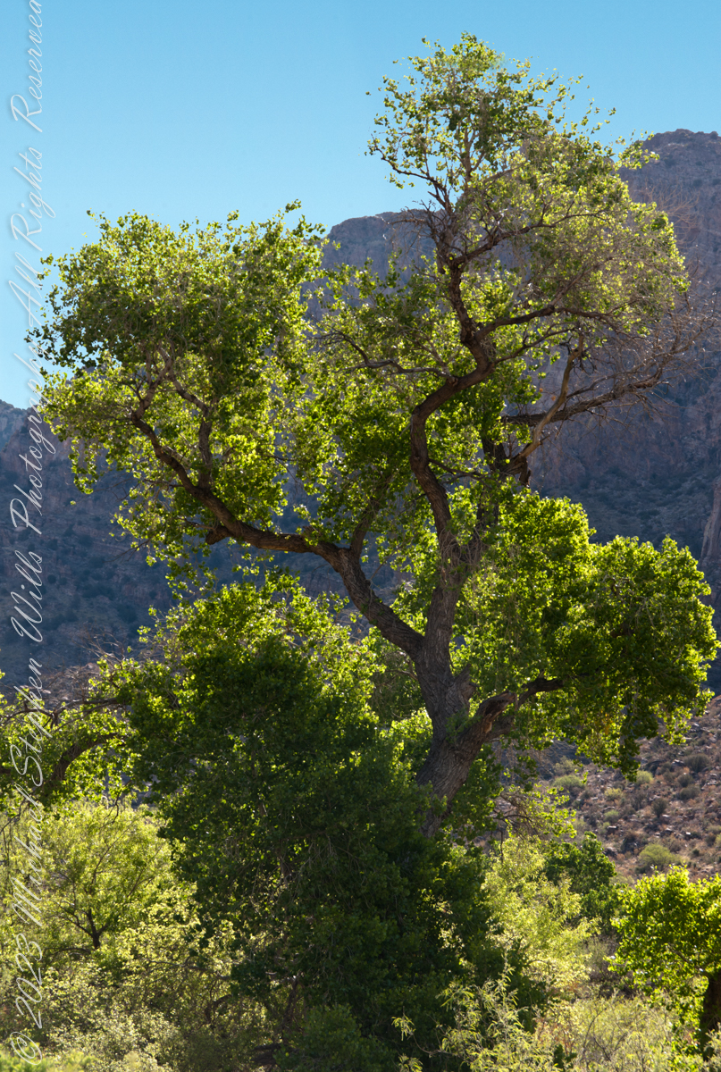 A large Fremont’s Cottonwood Offers shade and protection along the Pima Canyon Trail.