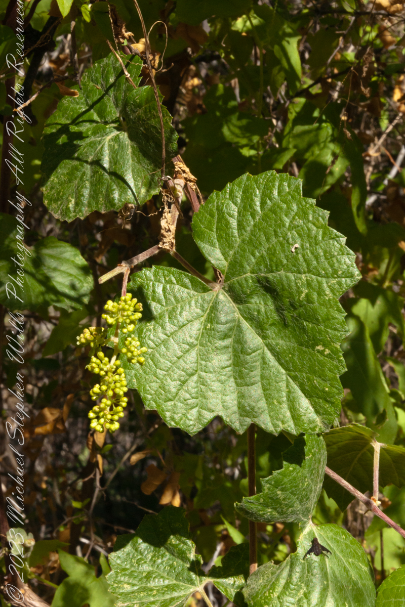 In the shade, a grapevine, offers a vain promise of grapes.