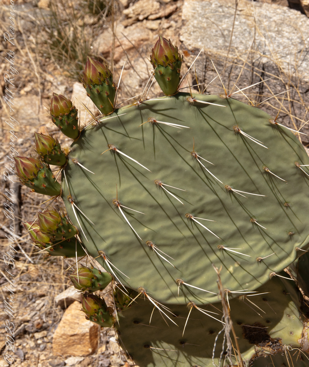 Here are 8 flower bud growing from one cladode (pad). There is a 9th bud on a second cladode. What is interesting about these pads are the needle shadows. Although thin, each provides some protection from the sun.