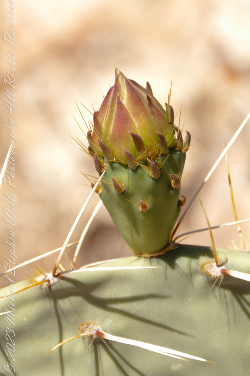 This delicate bud will develop into a flower and, then, into a cactus fruit (in spanish, tuna). The fruit retains those tiny spines, called glochids, which detach on the smallest contact. The pads are also covered with them.