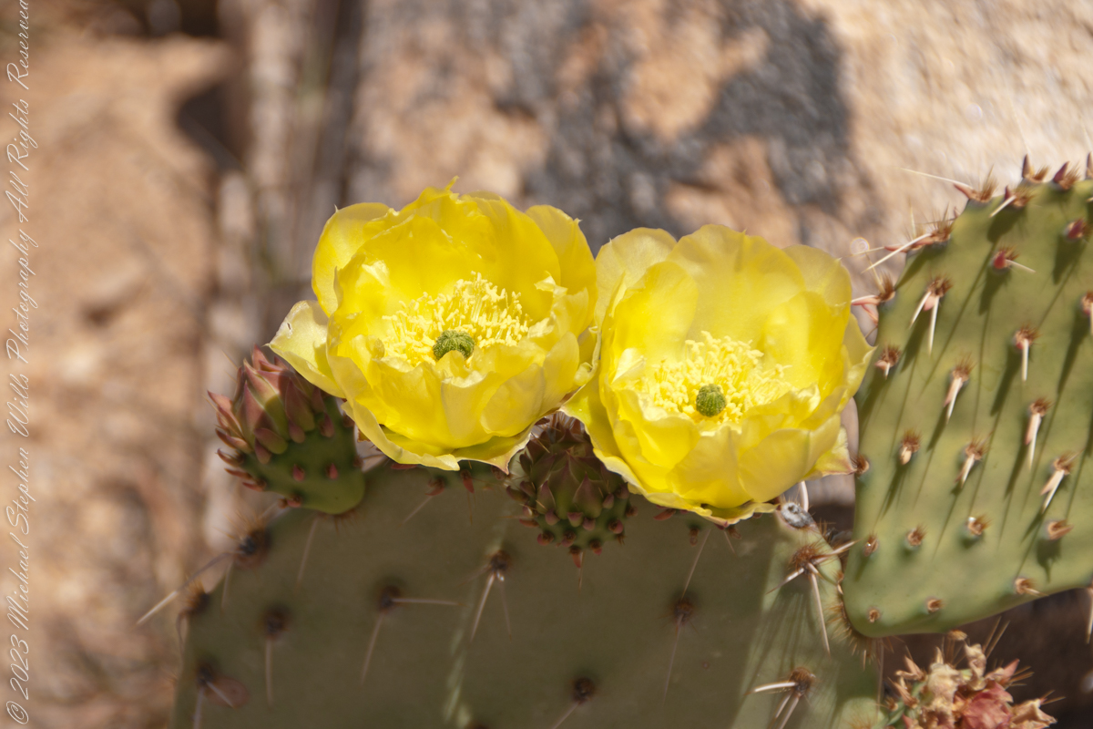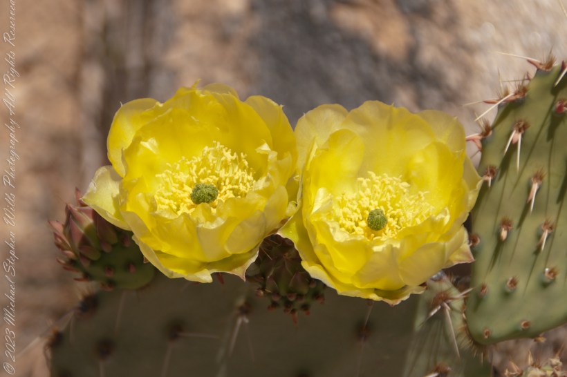 Look closely at the anthers of these flowers. Each curls over when touched, depositing its pollen. The habit of prickly pears to grow together in thickets mean there are clusters of blossoms in springtime.