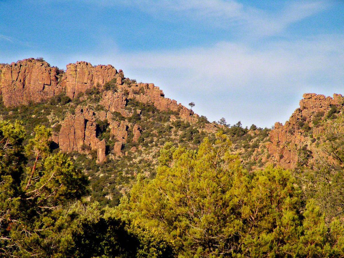 In the afternoon I explored the Arizona Trail to Reavis Ranch. It crosses the creek to ascend the cliff in broad switchbacks. Eventually it follows a contour below a cliff with fine views of Pine Creek Canyon. I turned back to leave the hike to Reavis Ranch for another day.