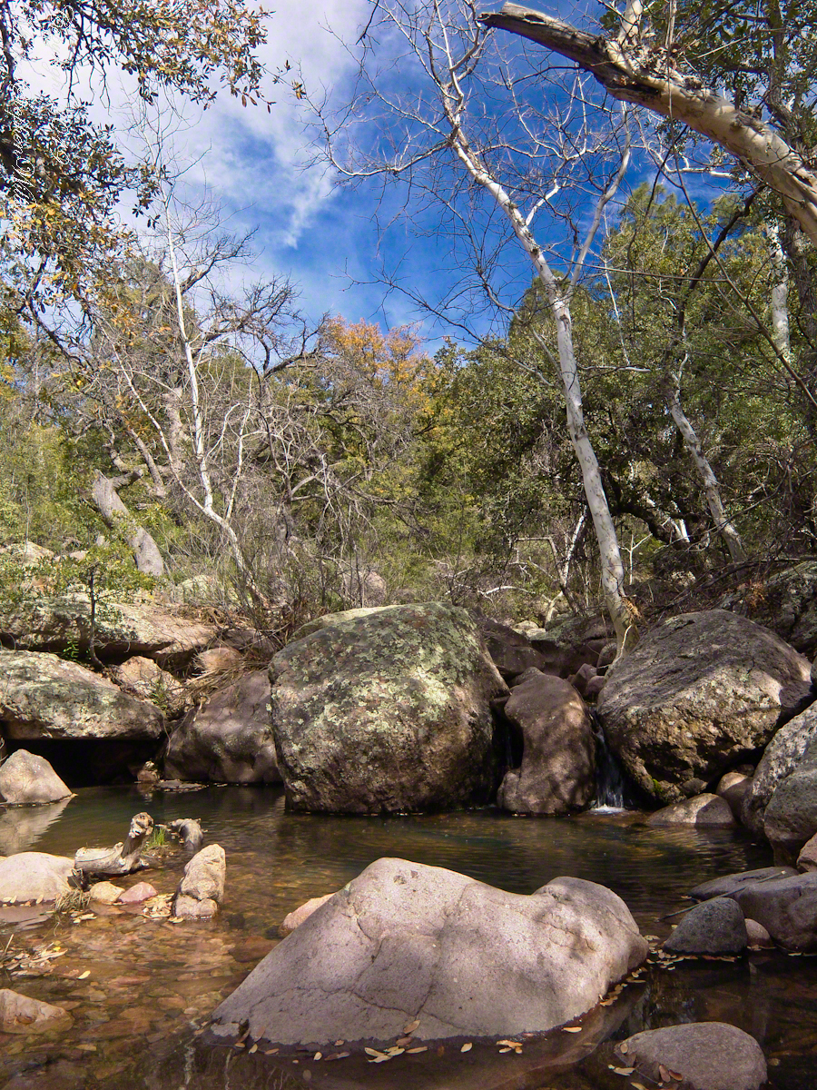 Turn left (up stream) where the Arizona Trail crosses Pine Creek and jump boulder to boulder for a hundred feet or so and you come to this view. The creek bank, covered by vegetation, rises on both sides and makes it difficult to leave the creek. Those are Arizona White Oak leaves floating along the large foreground boulder.