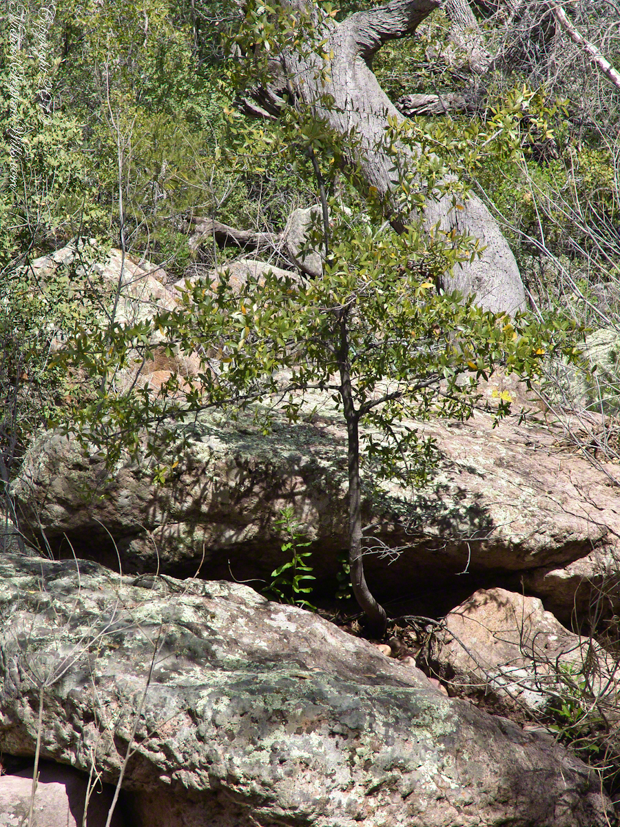 This is a very young Arizona White Oak, common species growing along the creek. The leaves are not what you’d expect from an oak, being 2 – 3 inches long in the shape of a lance blade and without obvious lobes Mature Arizona White Oak has a rough bark and, at most, 24 inch trunks.