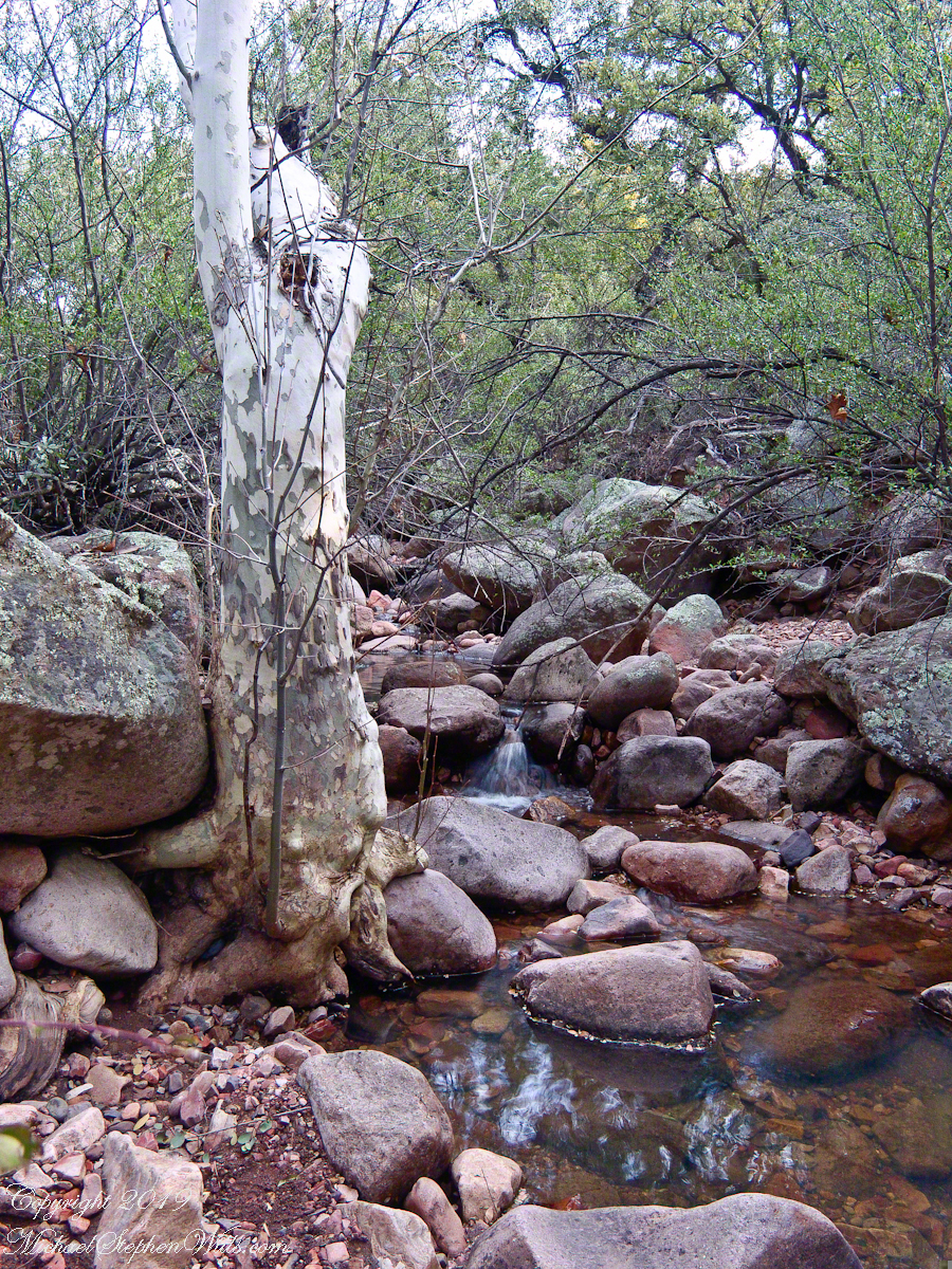 There are better examples of grand Arizona Sycamores along the perennial Reavis Creek. Pine Creek does not flow in the driest seasons, this tree sloughed its branches in order to survive. You can see from the many young Sycamores in the Pine Creek Pool photograph the previous photo the sycamores are successful in this environment.