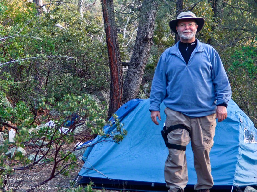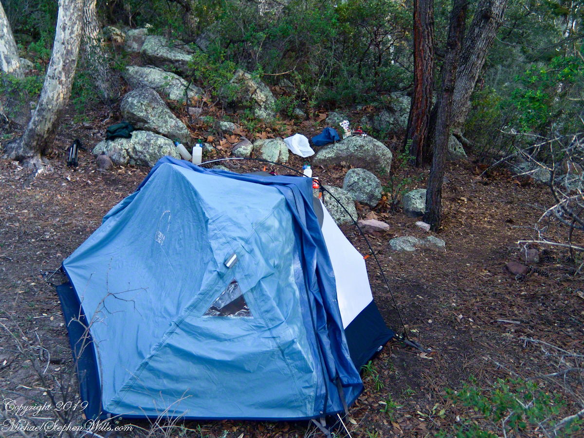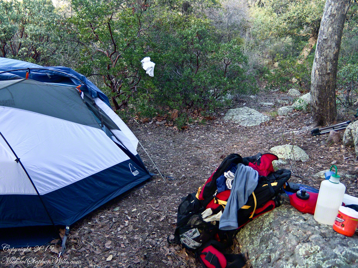 My third wilderness evening was unlike the others. I rested with an unhurried exploration of the camp area. Underfoot was a scatter of dry oak leaves, acorns on hardened desert soil not much softer than the numerous lichen encrusted boulders, all of which formed a bench above Pine Creek.