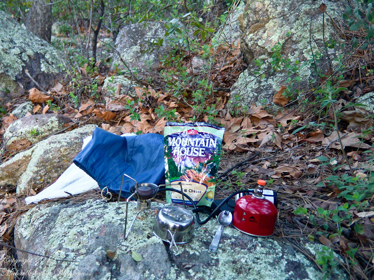 The kitchen: a very light gas burner, spork, dehydrated food with cup for beverages