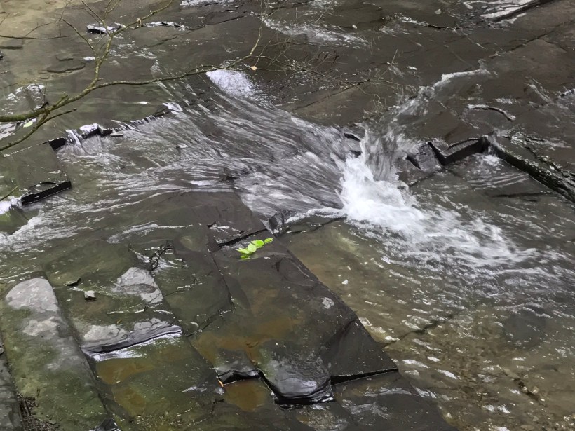 Above, is a view of the characteristic right angle faulting of the limestone base of Dry Creek, faulting produced when the North American plate pressed against the African plate, released, then after pivoting 90 degrees, pressed again against Africa before finally separating with the create of the Atlantic Ocean.