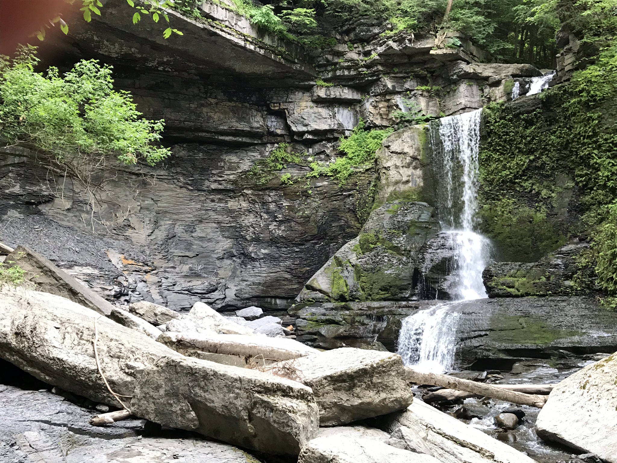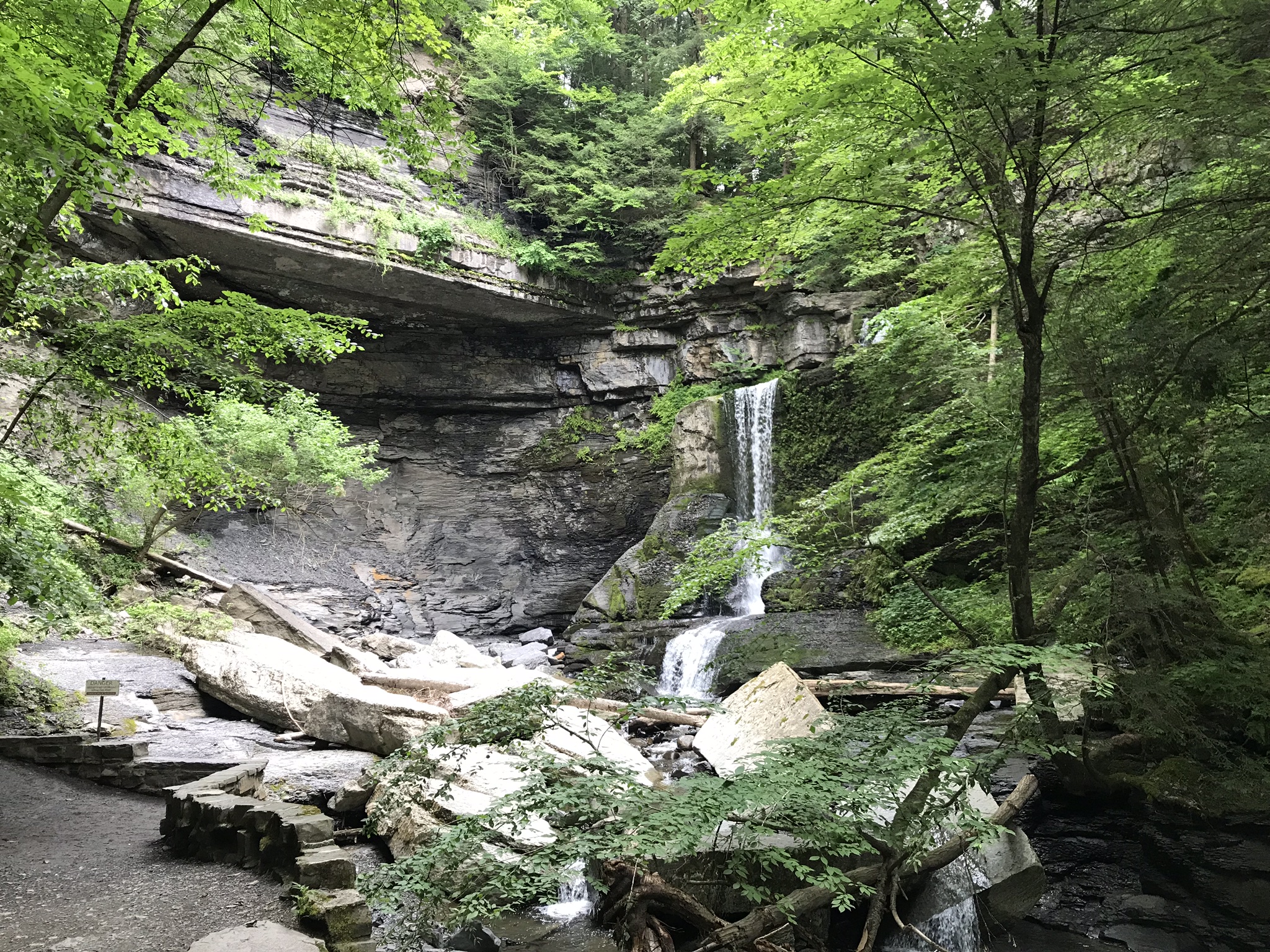 Cowsheds Waterfall is littered with enormous limestone blocks, remnants of a shelf. The rock under the limestone, a soft shale, is worn away first by running water forming a room (or Cowshed) under the limestone. Eventually, the limstone falls into the creek. The waterfall is at the end of a blind canyon with a sign at a trail end warning visitors to go no further. Careless visitors to Finger Lakes Gorges are killed, on occasion, by falling rock when they loiter beneath cliffs.