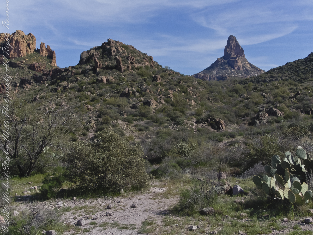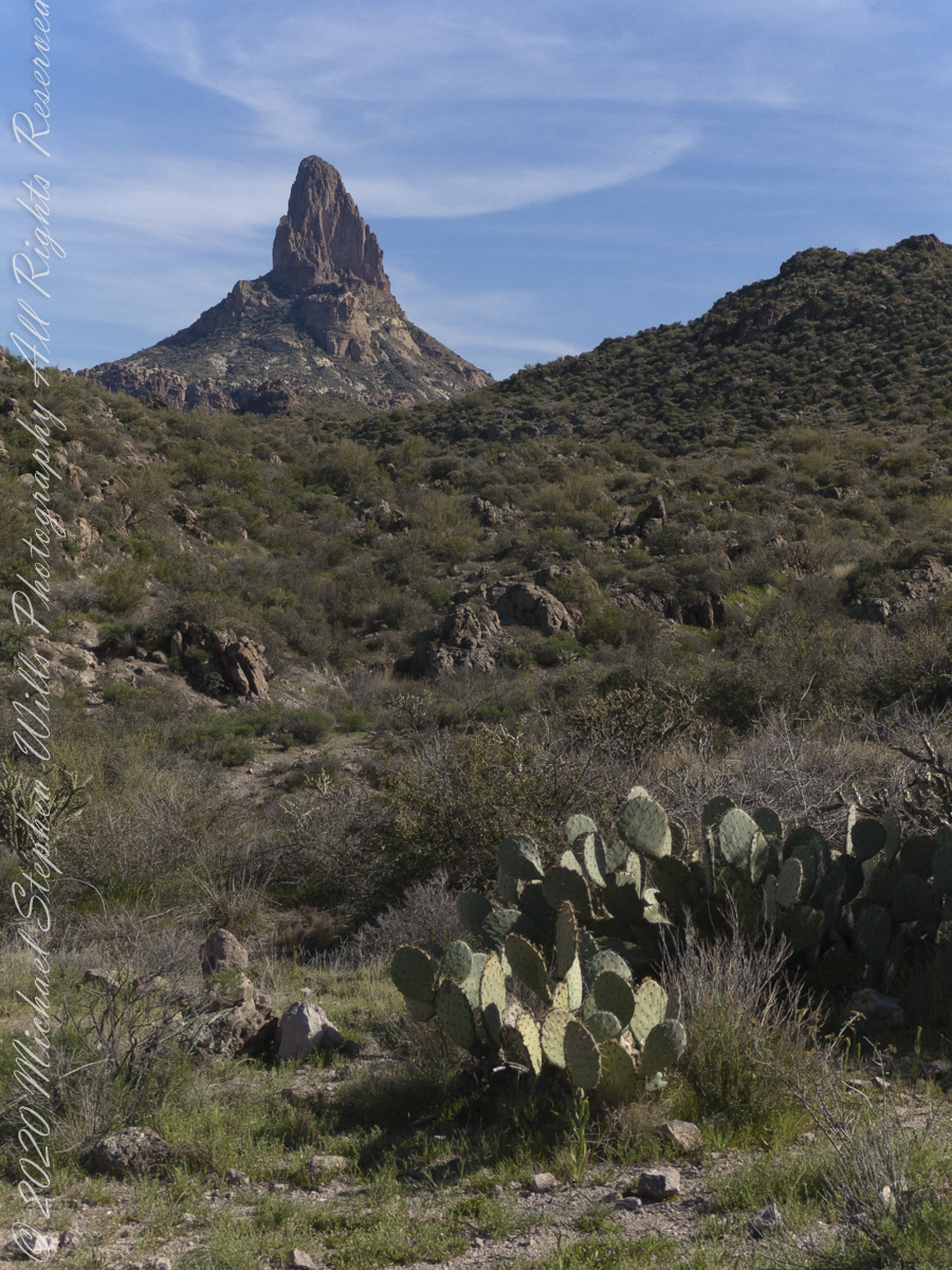 Two years later, on the evening of November 2, 2006, I climbed the Tanque Verde trail in Saguaro National Park East for about 30 minutes to reach a vantage point of Rincon Peak. Intending to capture the peak bathed in golden light, I waited until just before the sun set behind the Tucson Mountain. Afterwards, I raced the sun hiked back to the car. In my hurry, I tripped on a stepped turn and dove headfirst into a large prickly pear cactus. It was a very painful experience. Large spines pierced my face, while tiny, pesky spines covered my chest and back. The large spines, not being barbed, came out easily, but I needed to visit a physician to remove the rest.