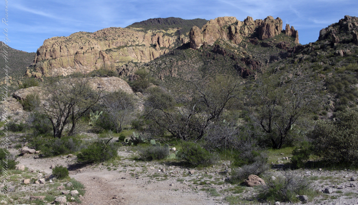 When we reached Deer Head Spring at the top of Turkey Creek Trail on April 27, 2004, it was a moist spot with no accessible water. With only about a gallon of water each remaining, we pressed ahead to Heartbreak Ridge and climbed into Happy Valley Saddle, where, thankfully, the creek—though low and full of algae—was usable. It was here that I caught my first glimpses of Rincon Peak, looking across the aptly named Heartbreak Ridge and Happy Valley Saddle.