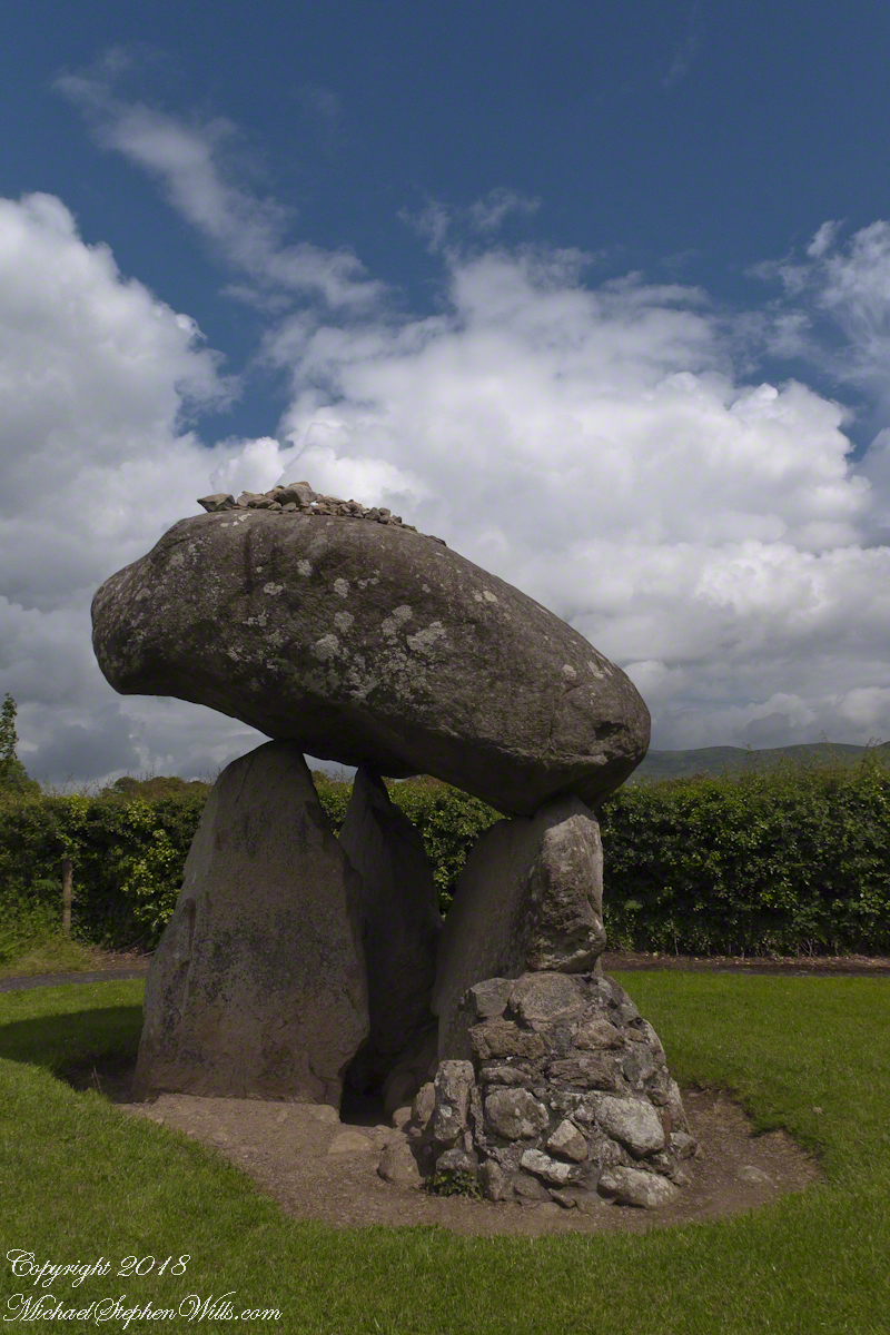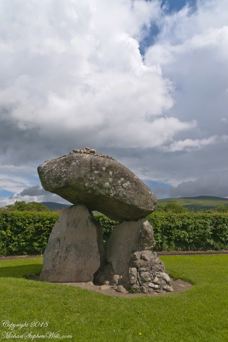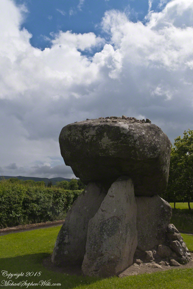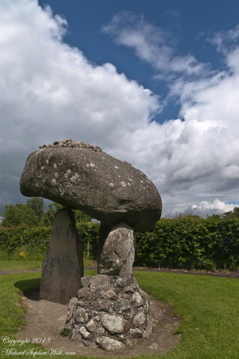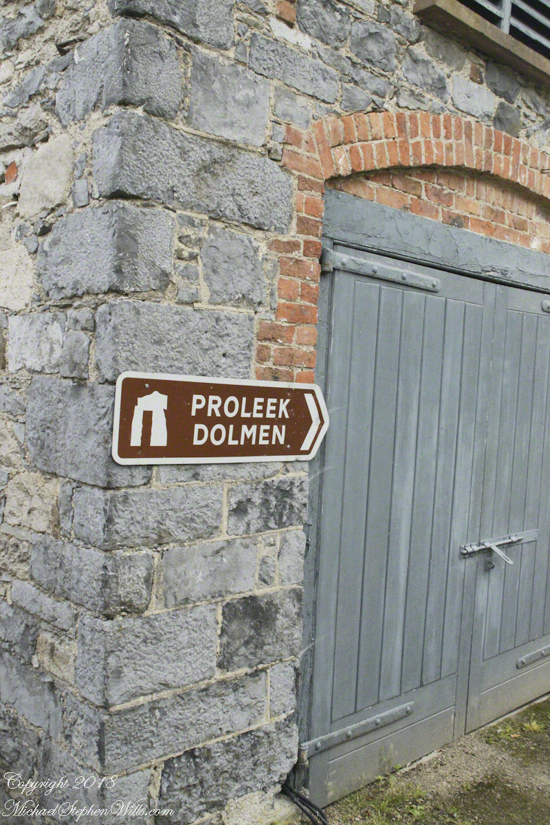 Our tour of Ireland was bookended by a visit to the farm site and, located little more than a kilometer away, a 5,000+ year old portal tomb, the last site Pam and I visited. We parked at the hotel / golf course built around the monuments. There is no fee to visit the site, number 476 on the list of Republic of Ireland National Monuments (Irish: Séadchomhartha Náisiúnta), protected at the level of guardianship by the National Monuments Act of 1930. The townland is named after the dolmen. The anglicized “Proleek” is derived from the Irish for “bruising rock”, as in a millstone. The grave is attributed in folklore to the resting place of the Scotch Giant, Para Buidhe More Mahac Seoidin, who came to challenge Fin Mac Coole.