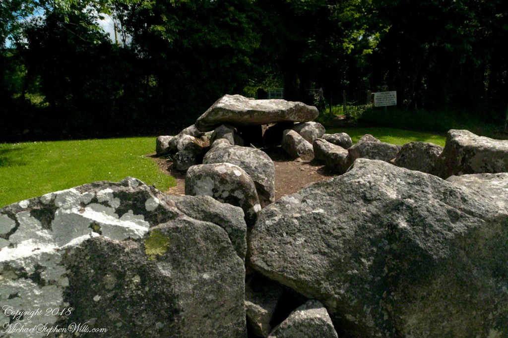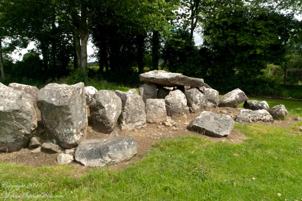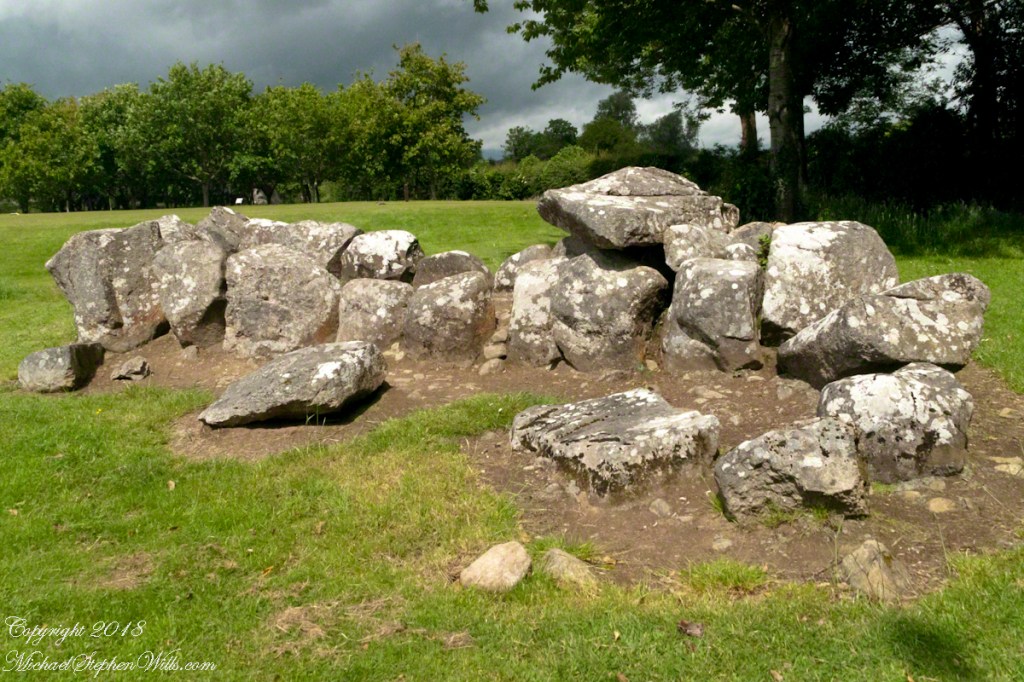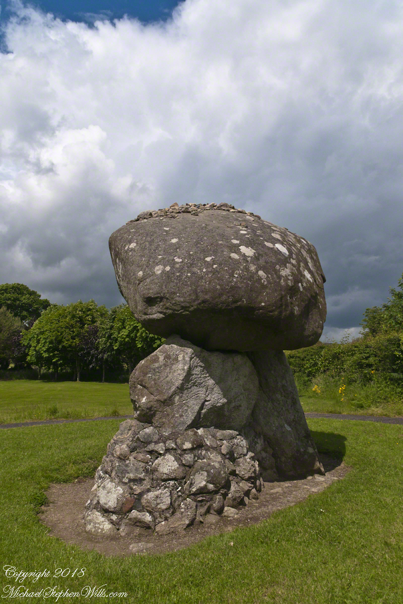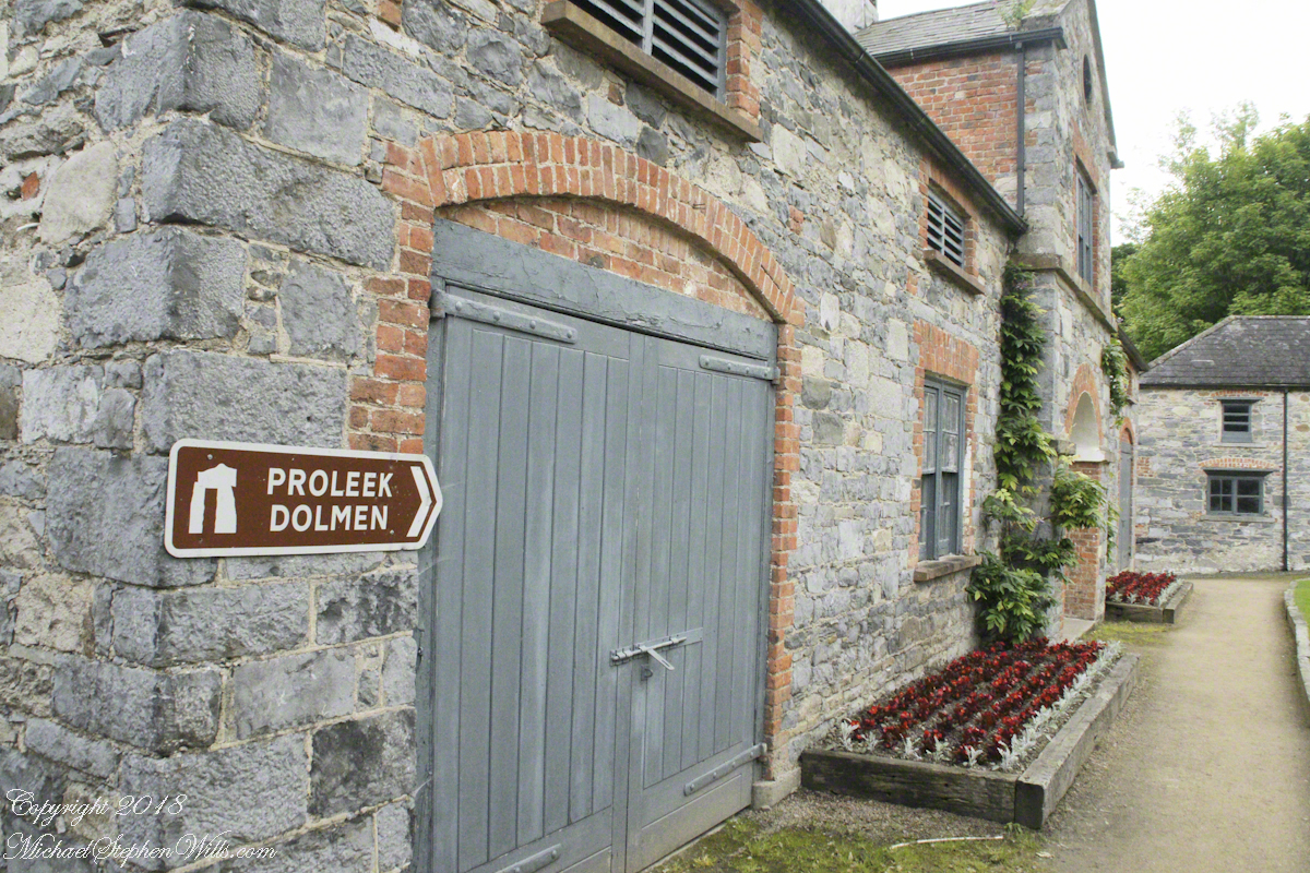 Our tour of Ireland was bookended by a visit to the farm site and, located little more than a kilometer away, a 5,000+ year old portal tomb, the last site Pam and I visited. We parked at the hotel / golf course built around the monuments. There is no fee to visit the site, number 476 on the list of Republic of Ireland National Monuments (Irish: Séadchomhartha Náisiúnta), protected at the level of guardianship by the National Monuments Act of 1930. The townland is named after the dolmen. The anglicized “Proleek” is derived from the Irish for “bruising rock”, as in a millstone. The grave is attributed in folklore to the resting place of the Scotch Giant, Para Buidhe More Mahac Seoidin, who came to challenge Fin Mac Coole.