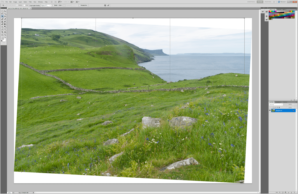 In Photoshop, make a copy of the file and crop out reference to the crooked horizon. In this case, my focus is the wild flower meadow. The raw image was large enough leave enough pixels for a usable image.