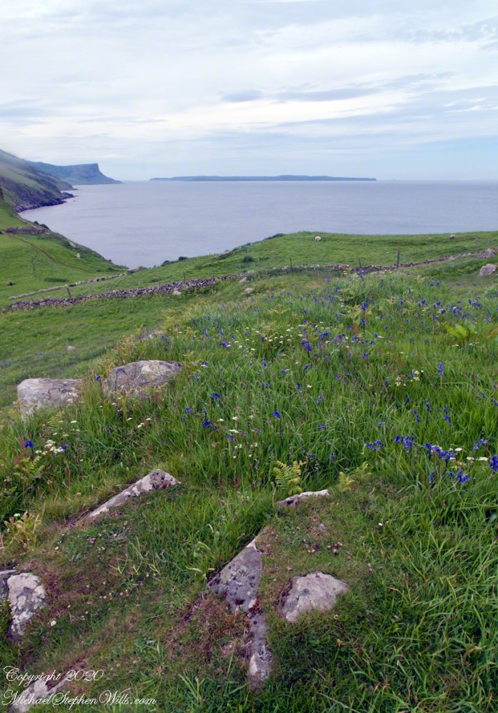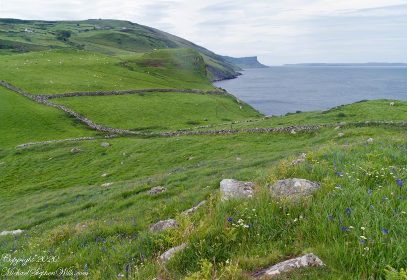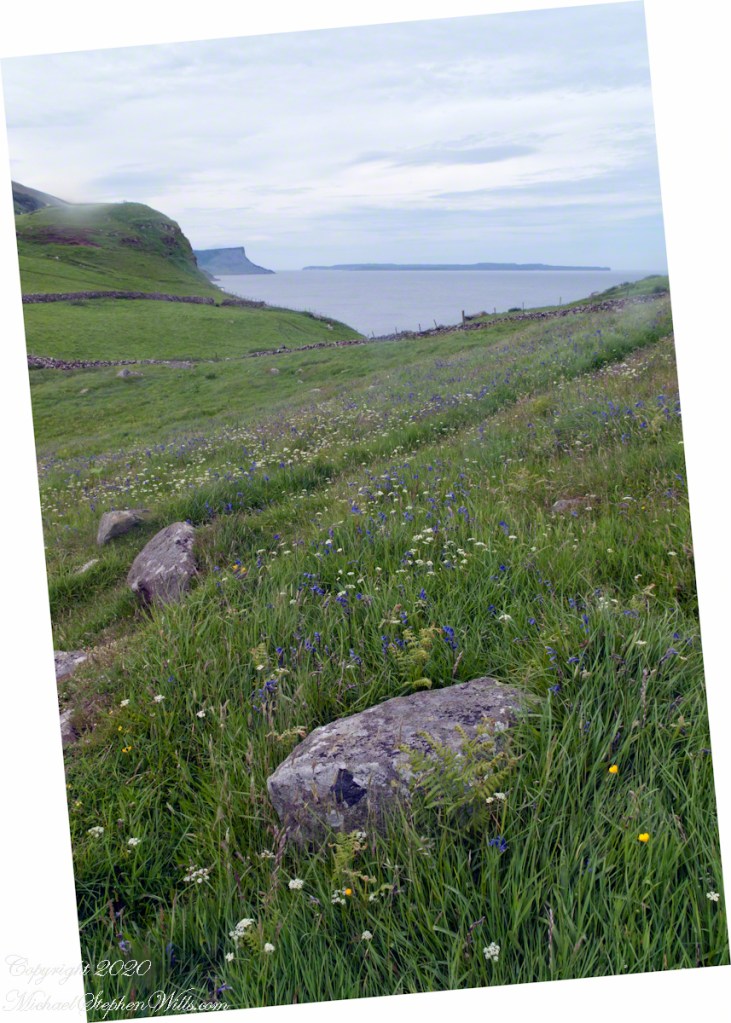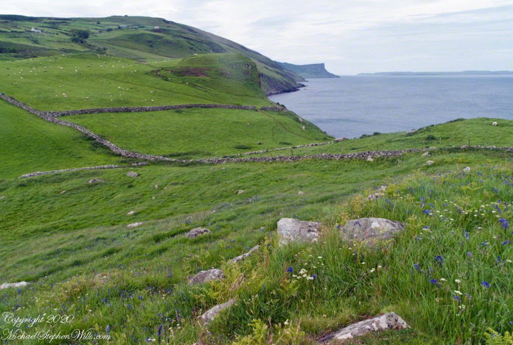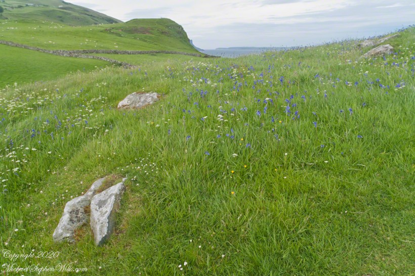 It was the bluebells in this photograph that clued me into why I took a photograph of the hillside.  The view north takes in coastal sheep pasture looking on a portion of North Channel and the Irish island Rathelin.
