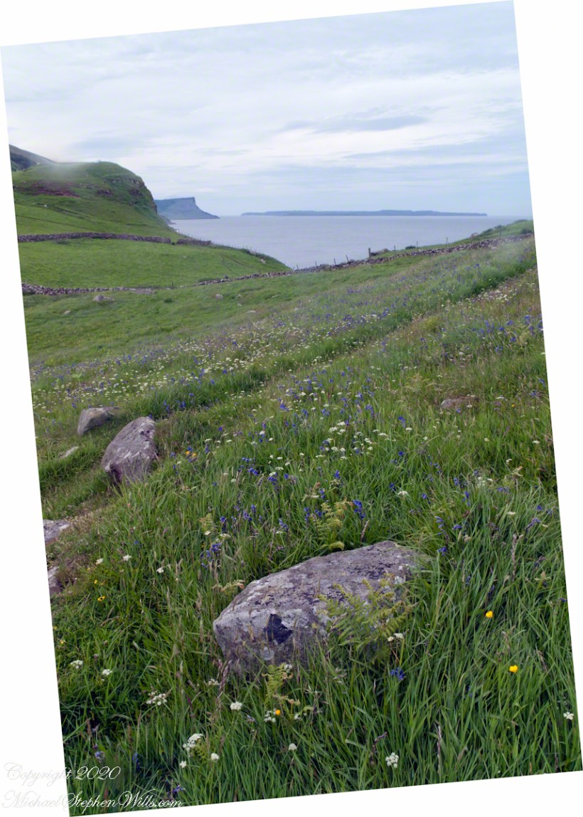 The end result is a view of wildflower meadow, foreground, coastal sheep pastures running up the high hill. Named Greenanmore, the hill is a site notable for a neolithic passage tomb. The distant land across the North Channel water is Rathelin Island.