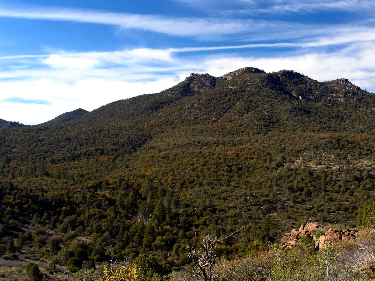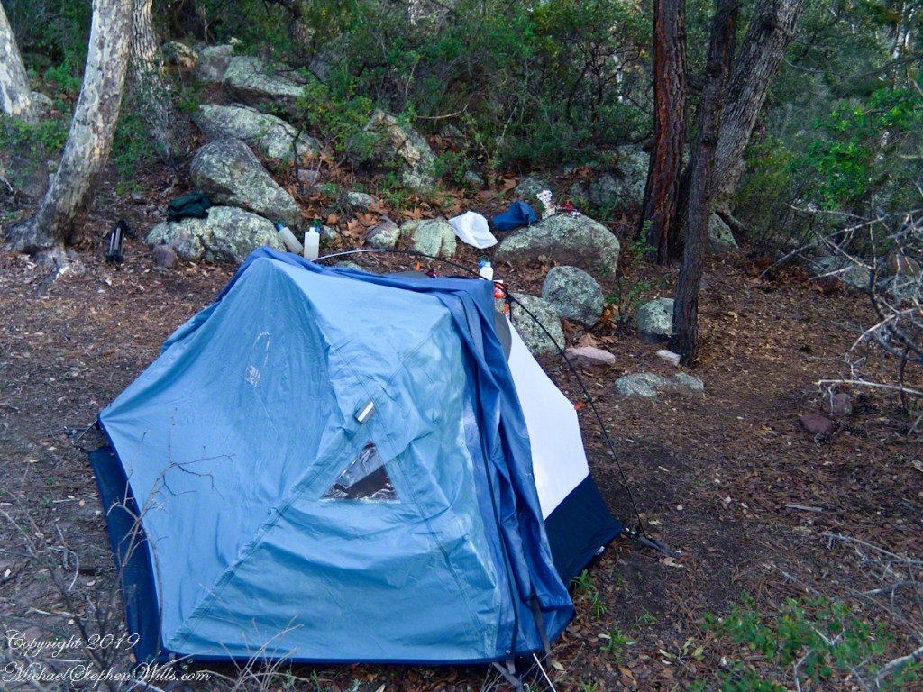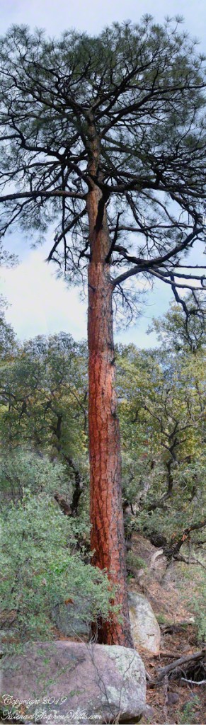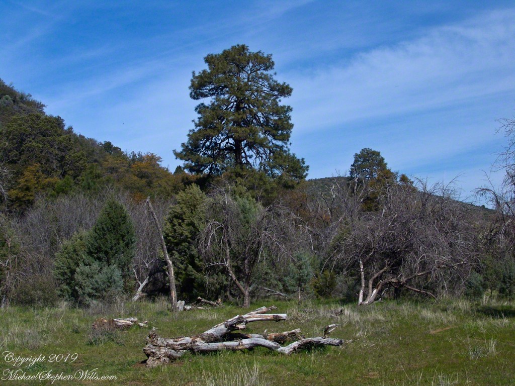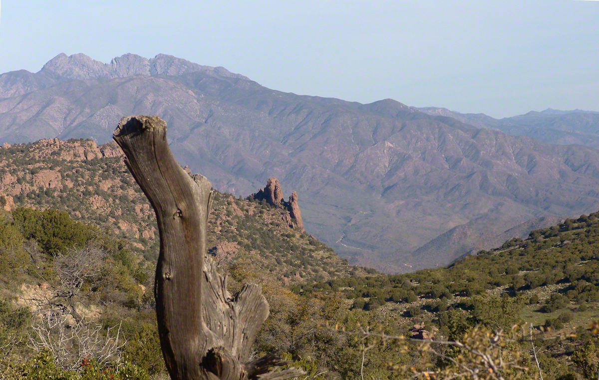 On the east side of Pine Creek a trail, unmarked on the maps, follows the creek bed uphill north towards Mound Mountain. In 50 feet or so we passed the side trail to my campsite, our destination was The Searcher’s campsite. I was not paying near enough attention to the surroundings when I looked up to see an Arizona Oak limb headed to my chest. With no time or space to negotiate the obstacle I was left to grab hold and hang on to be swept from the saddle. The branch held my bulk for, at most, a second before giving way.