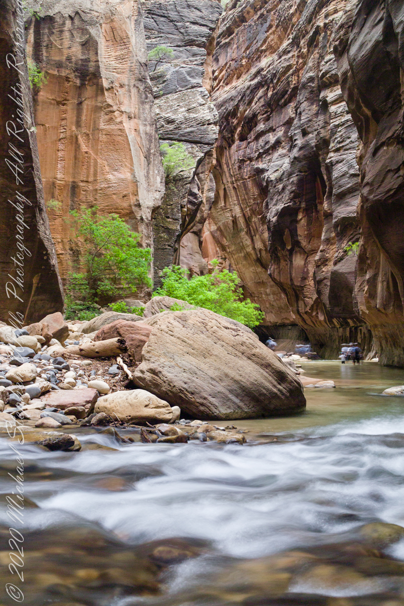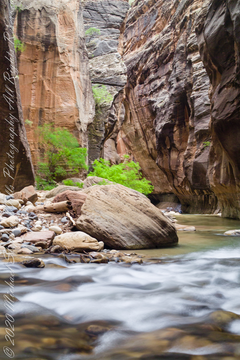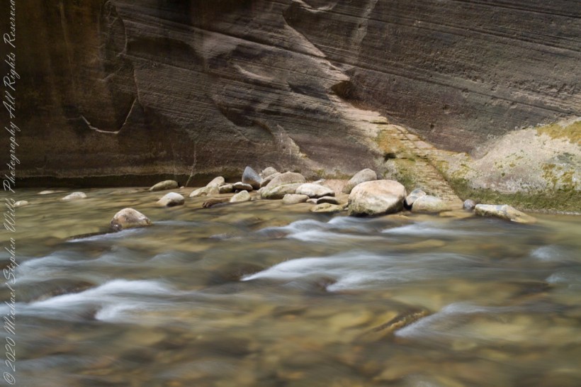 In Zion National Park, where towering sandstone cliffs rise from the desert floor, the Virgin River weaves a persistent and graceful thread through deep canyons carved over millennia. The river is the creative force behind Zion’s signature landscape, sculpting stone with a patient hand. Among its greatest achievements is the Narrows—a sinuous gorge where water and light perform a timeless duet. The two photographs shown here draw us into an intimate corner of that realm, where water flows past a rock face marked by both subtlety and drama.