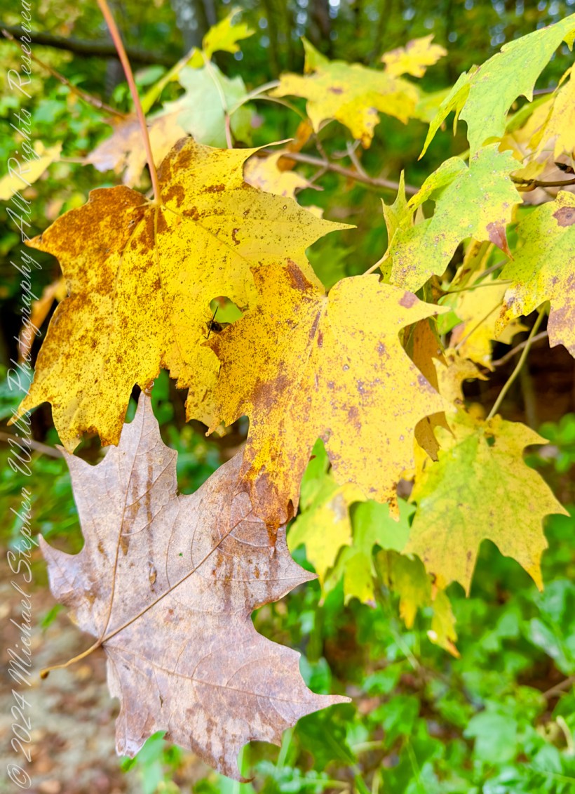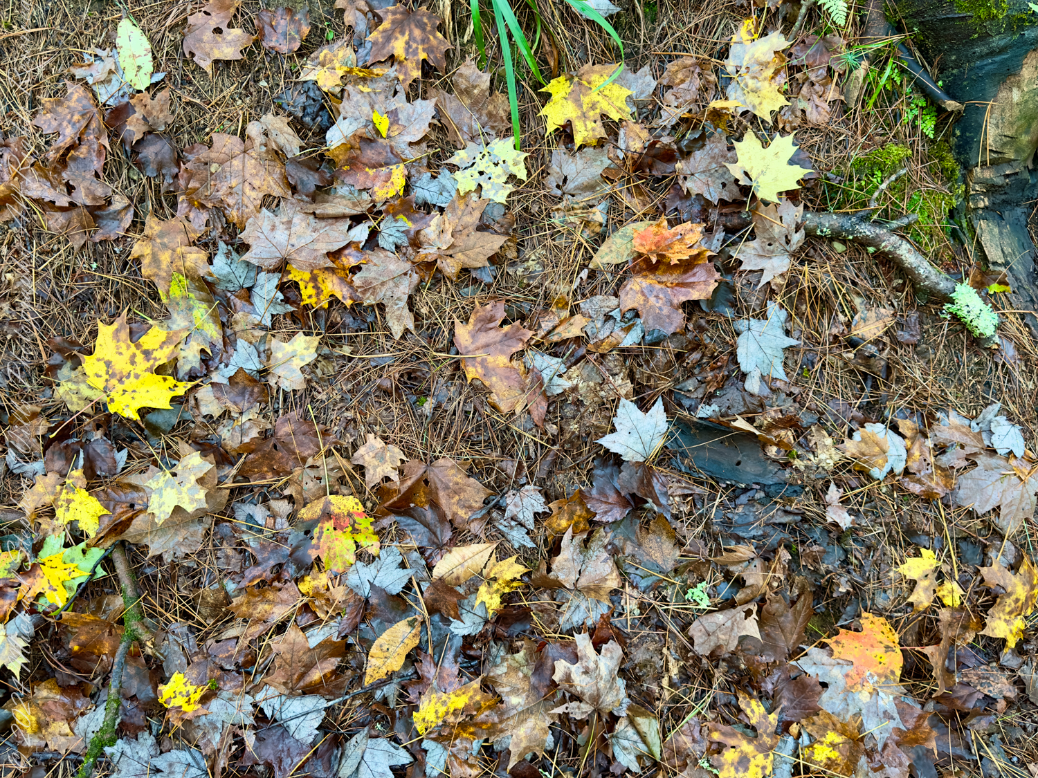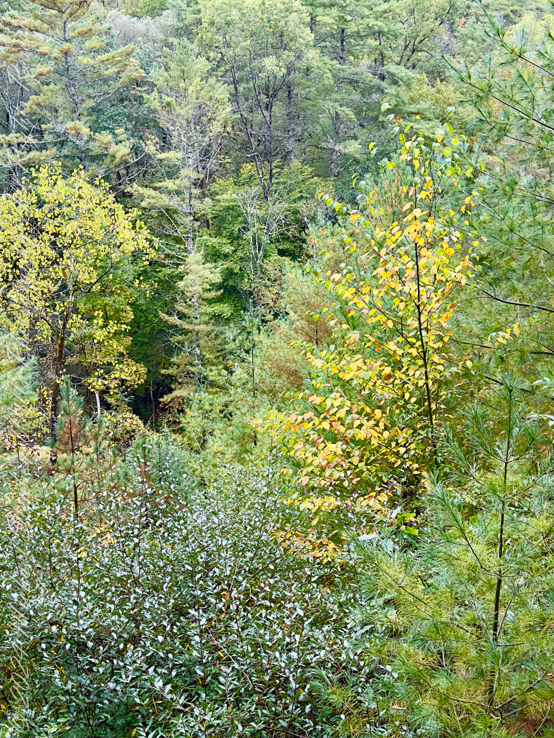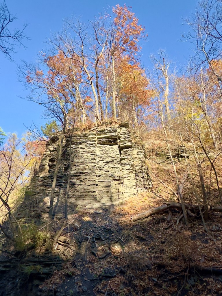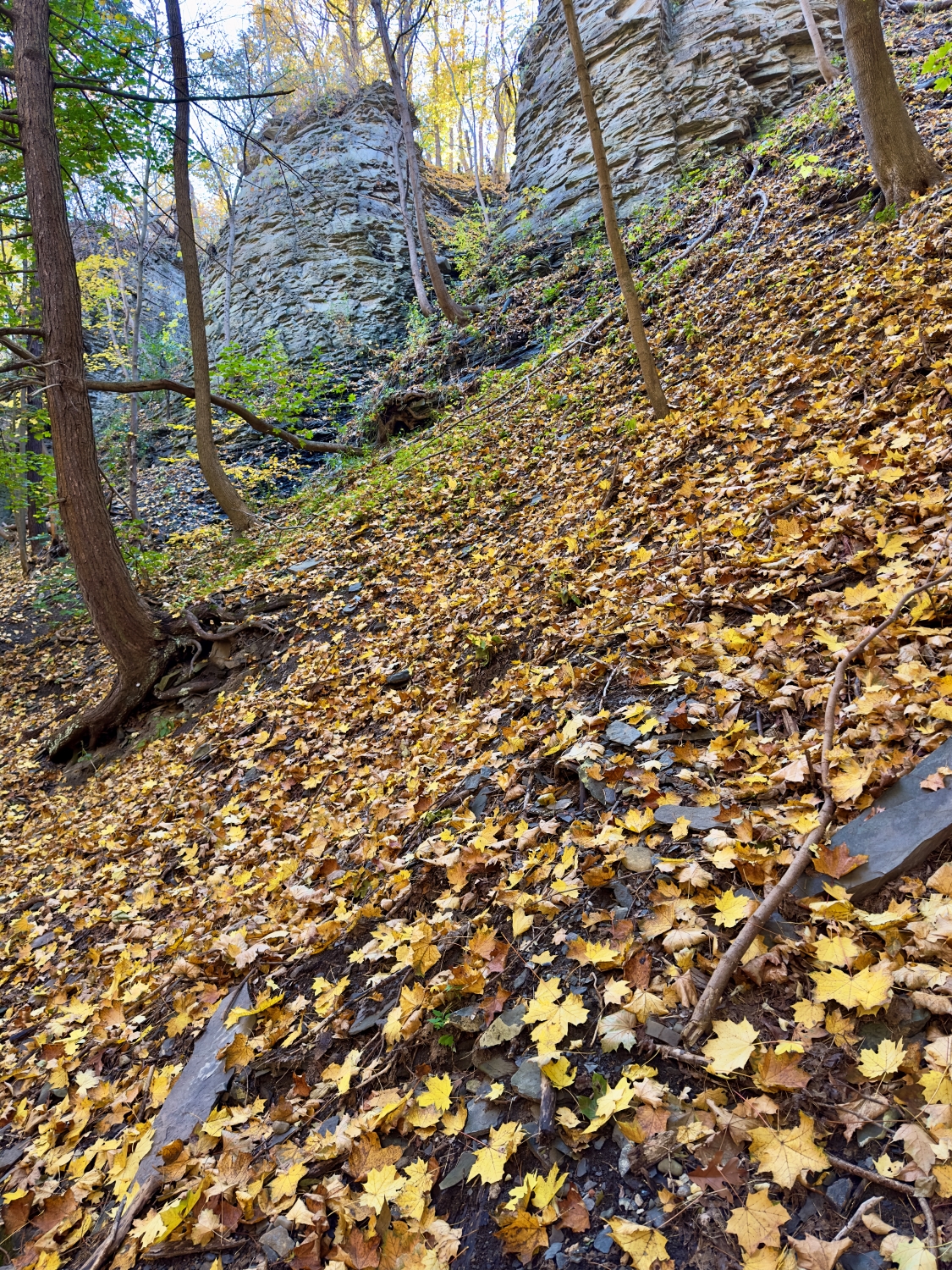 I move further along the trail, and the terrain begins to shift. Fallen leaves create a golden carpet along the path, their crisp shapes overlapping like nature’s confetti celebrating the season. Each step crunches underfoot, adding my own rhythm to the symphony of sounds. The trees overhead are a kaleidoscope of colors—deep golds, fiery oranges, and the occasional flash of red from Virginia Creeper vines (Parthenocissus quinquefolia). Together, the trees create a canopy that filters sunlight, casting dappled patterns on the gorge walls. It’s an ever-changing play of light and shadow, one moment bright and the next subdued, adding a layer of magic to the experience.