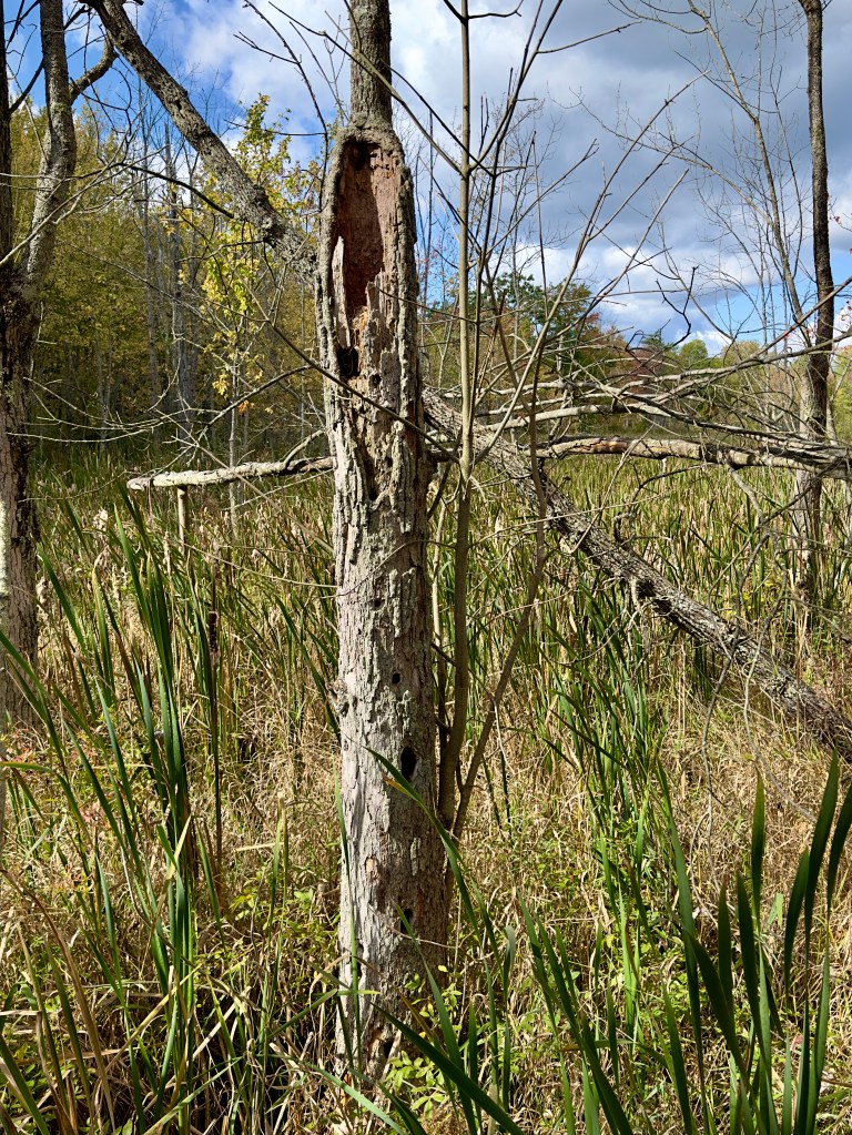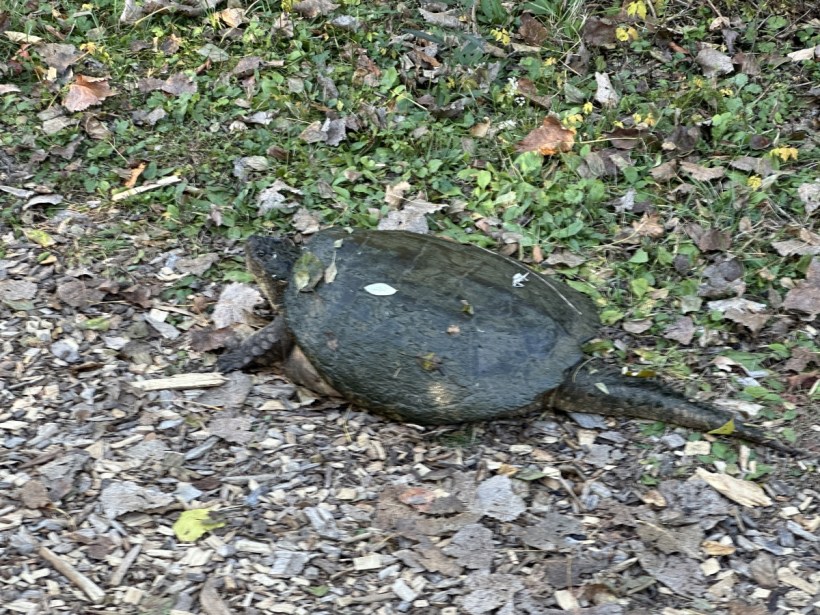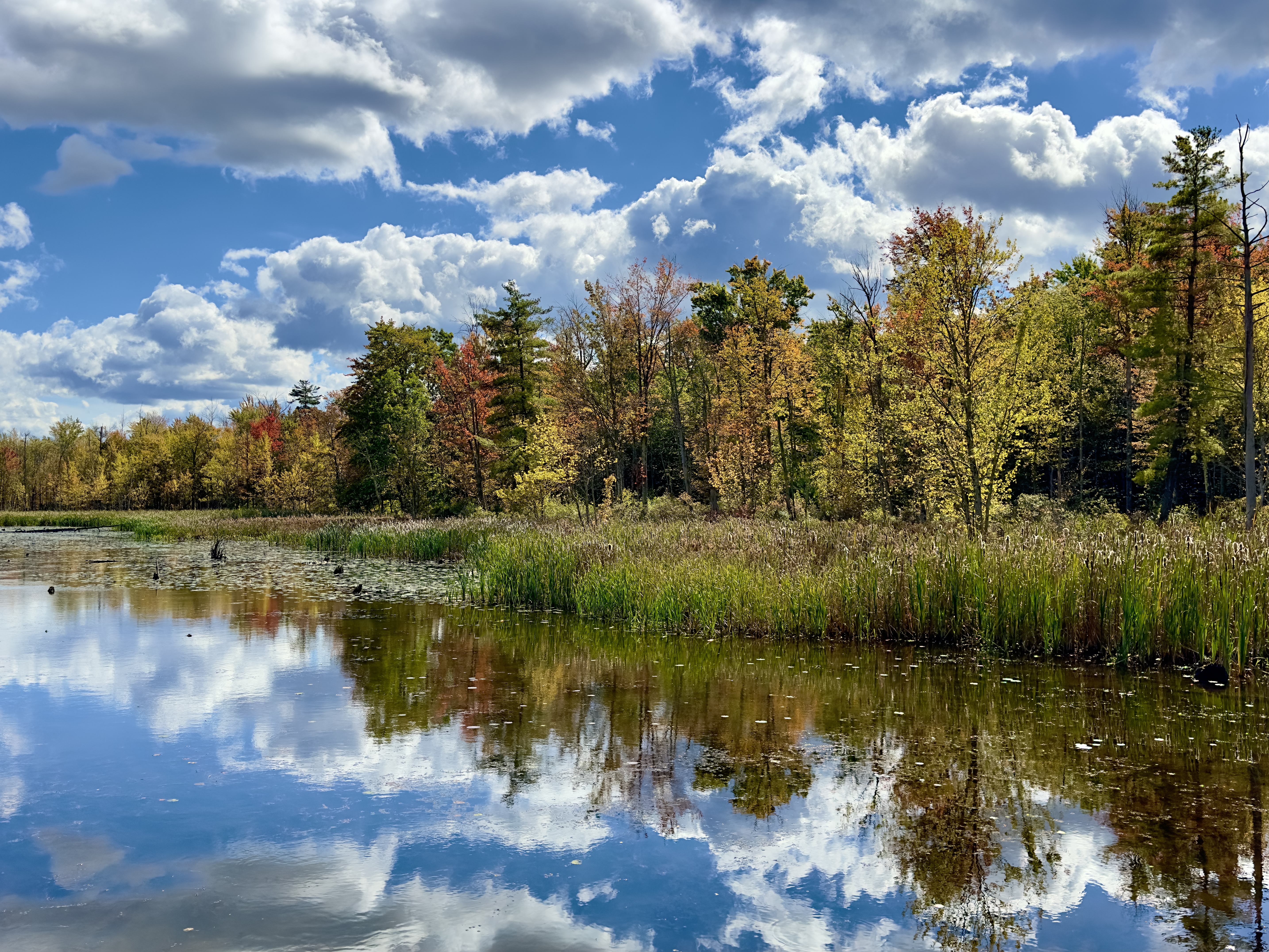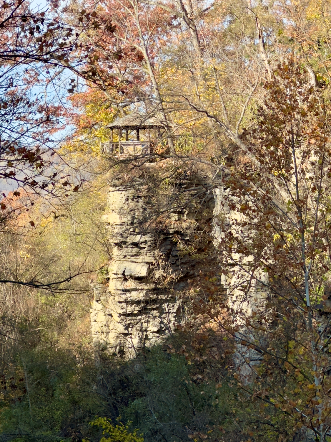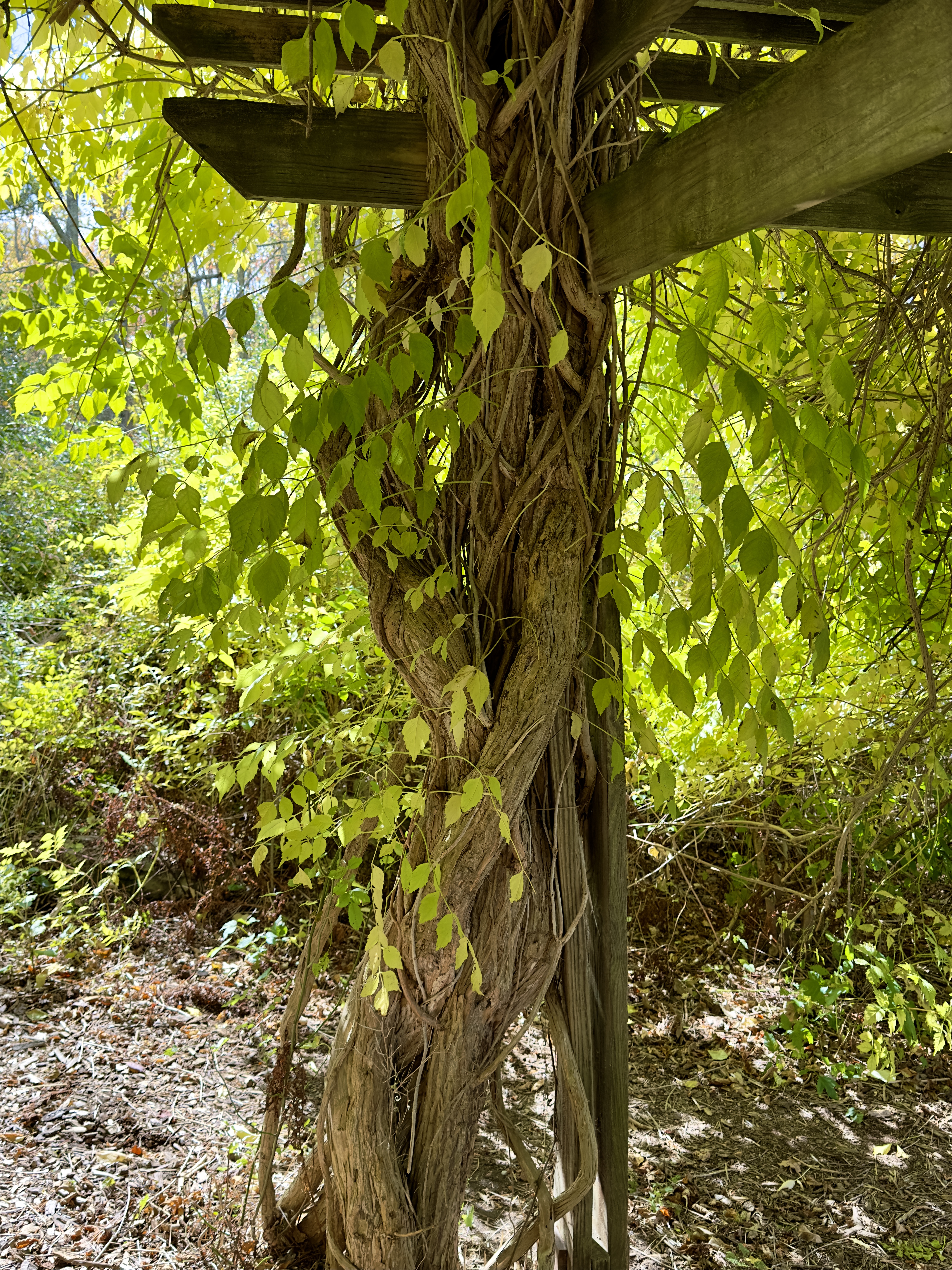 I move further along the trail, and the terrain begins to shift. Fallen leaves create a golden carpet along the path, their crisp shapes overlapping like nature’s confetti celebrating the season. Each step crunches underfoot, adding my own rhythm to the symphony of sounds. The trees overhead are a kaleidoscope of colors—deep golds, fiery oranges, and the occasional flash of red from Virginia Creeper vines (Parthenocissus quinquefolia). Together, the trees create a canopy that filters sunlight, casting dappled patterns on the gorge walls. It’s an ever-changing play of light and shadow, one moment bright and the next subdued, adding a layer of magic to the experience.