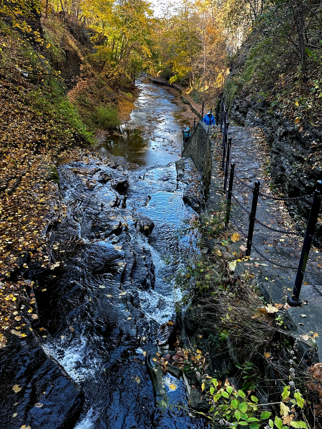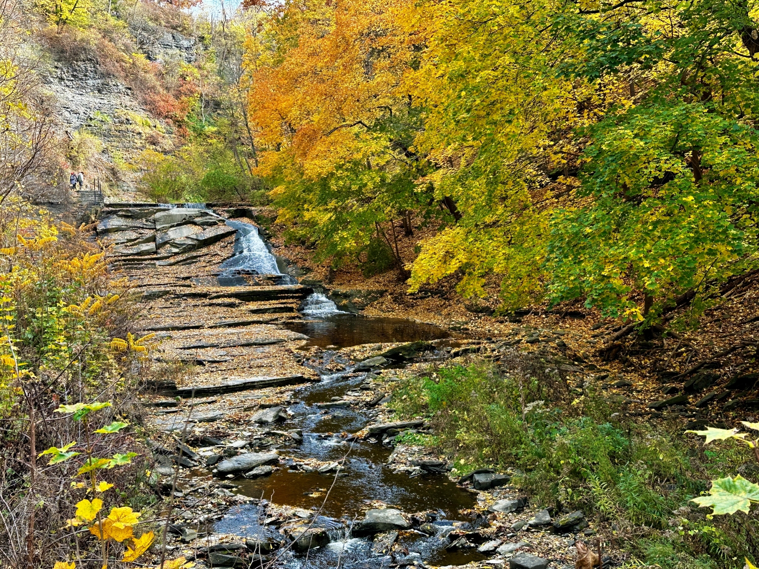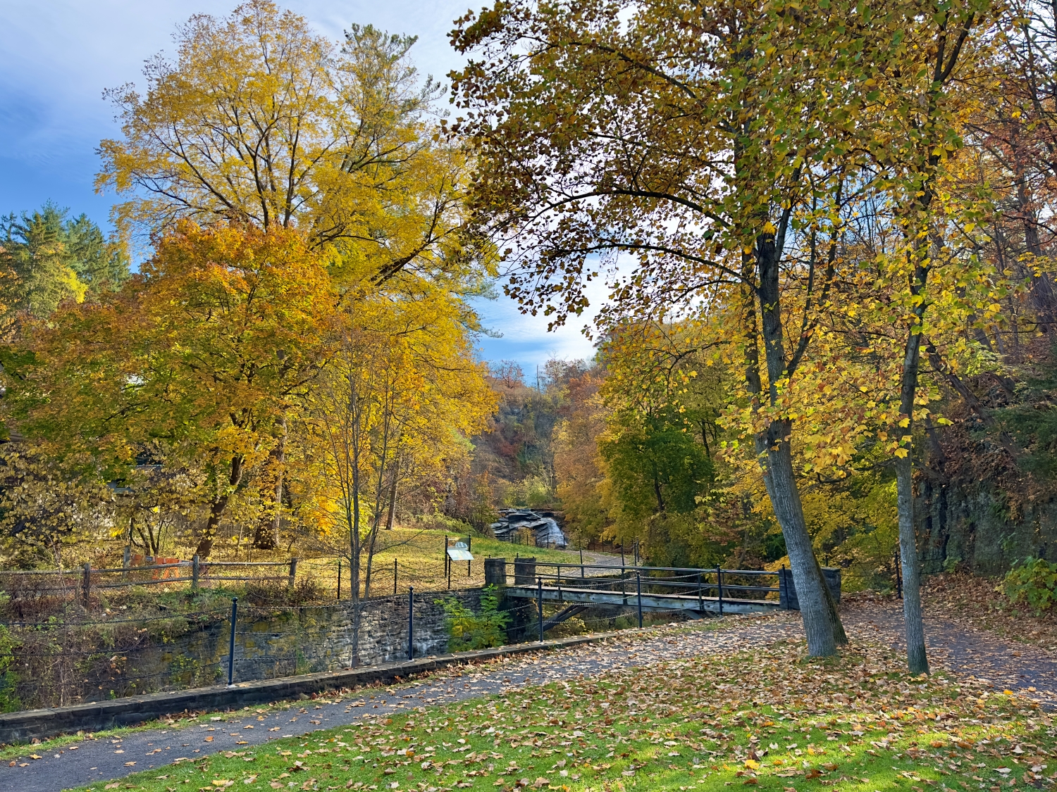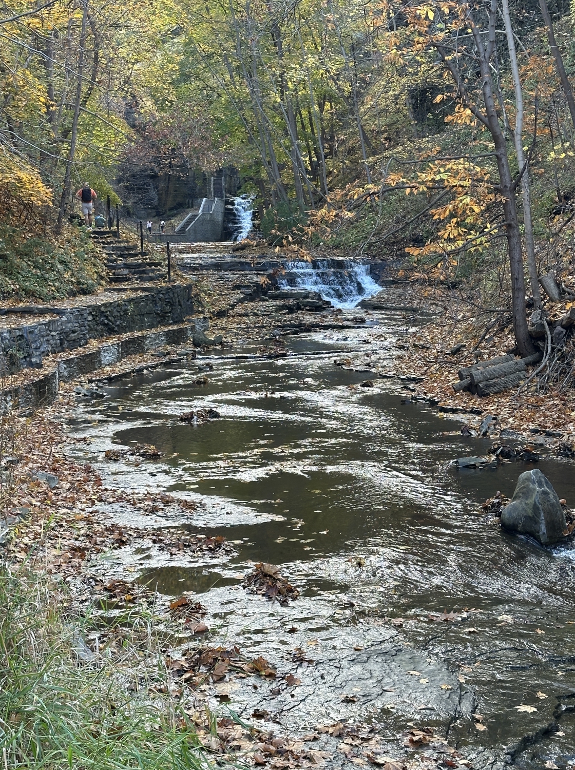As I step into Cascadilla Gorge from the Linn Street entrance, I’m greeted by the soft rustling of leaves and the constant, soothing rush of water. The air this Halloween Day is warm, the autumn colors vibrant against the cool blue sky. I know Cascadilla Gorge is part of the Cornell Botanical Gardens, but the immediate beauty of this natural sanctuary makes it easy to forget I’m still within the city limits of Ithaca. The sounds of the gorge draw me in, as if whispering there’s more to see, more to explore. With a deep breath, I begin my journey up the trail, eager to discover what lies ahead.