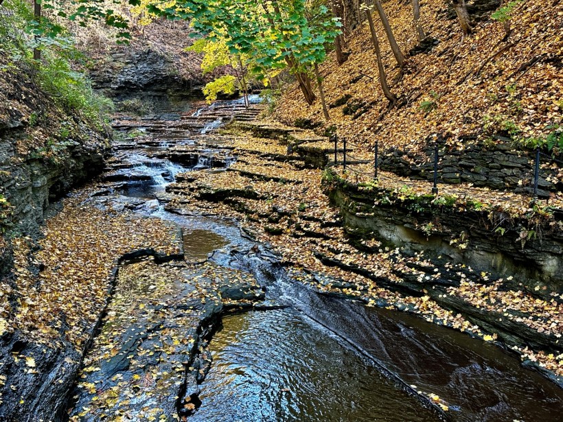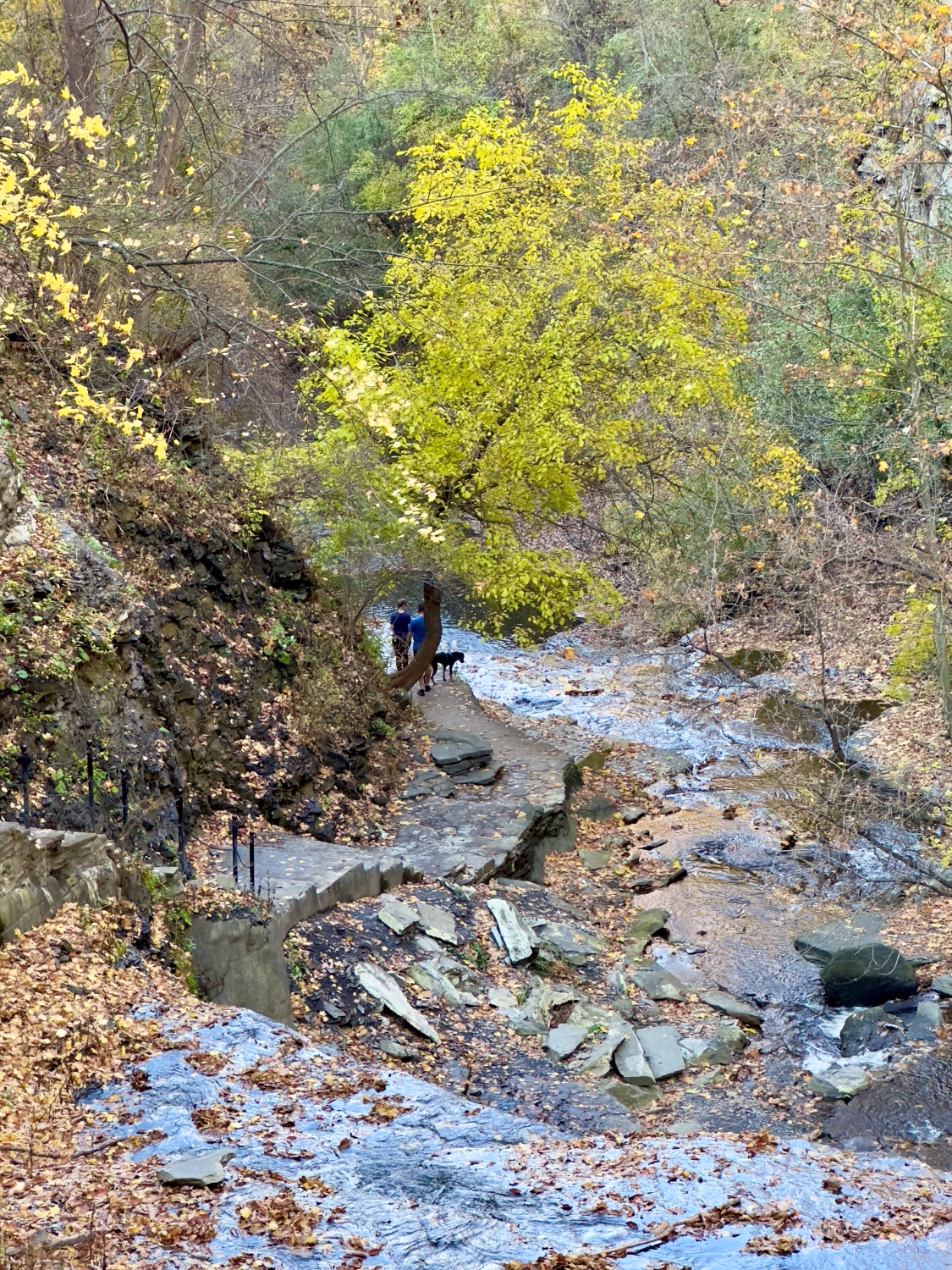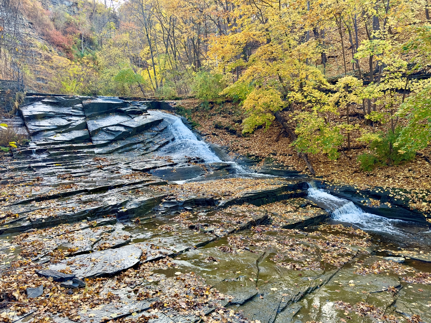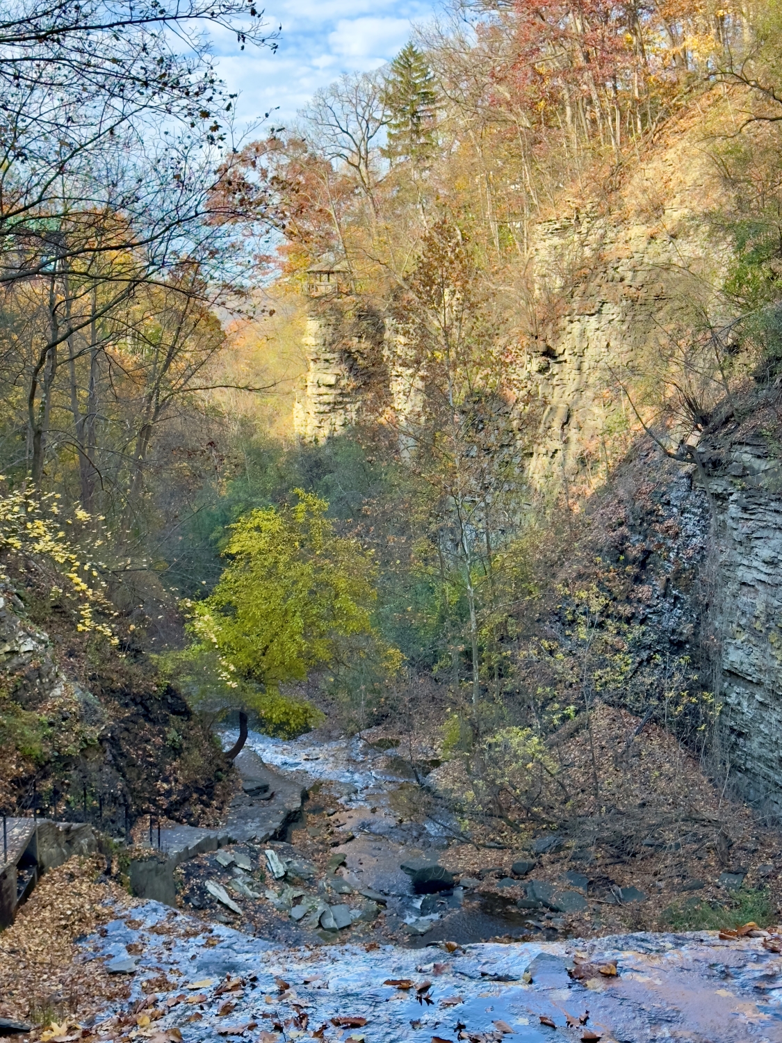 As I step into Cascadilla Gorge from the Linn Street entrance, I’m greeted by the soft rustling of leaves and the constant, soothing rush of water. The air this Halloween Day is warm, the autumn colors vibrant against the cool blue sky. I know Cascadilla Gorge is part of the Cornell Botanical Gardens, but the immediate beauty of this natural sanctuary makes it easy to forget I’m still within the city limits of Ithaca. The sounds of the gorge draw me in, as if whispering there’s more to see, more to explore. With a deep breath, I begin my journey up the trail, eager to discover what lies ahead.