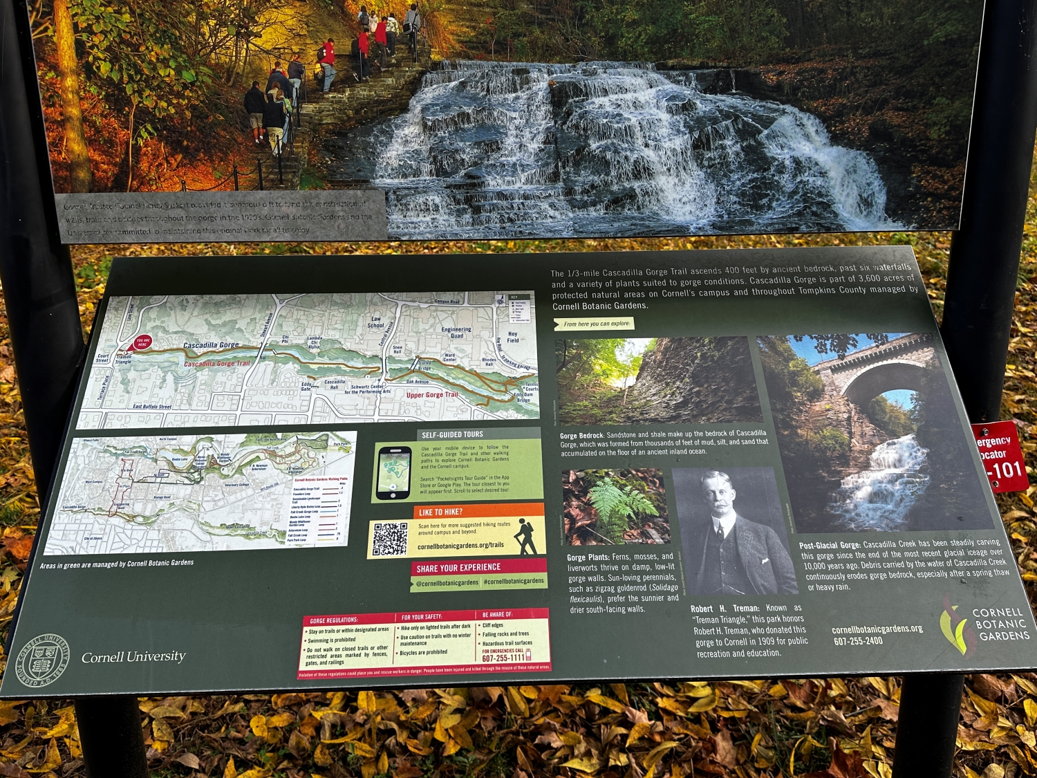 Along the way, I come across an interpretive sign provided by the Cornell Botanical Gardens. They tell the story of Cascadilla Gorge, how it was formed from the bedrock of sandstone and shale that eroded from mountains to the east, in the Devonian era when an ancient inland sea covered the region. The signs also introduce Robert H. Treman, a philanthropist who saw the beauty and educational value of the gorge. Thanks to him and the efforts of many, this natural wonder is preserved for all to experience. Knowing this adds depth to my walk; it’s a reminder that places like this exist not only by chance but because people cared enough to protect them.