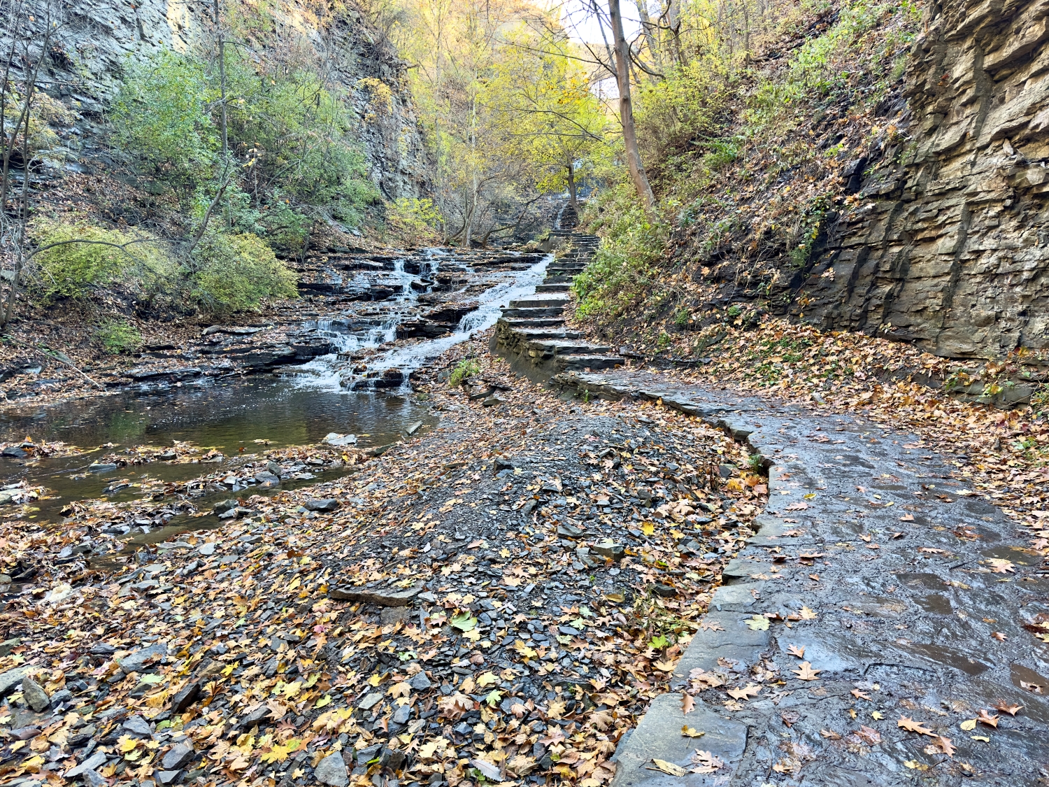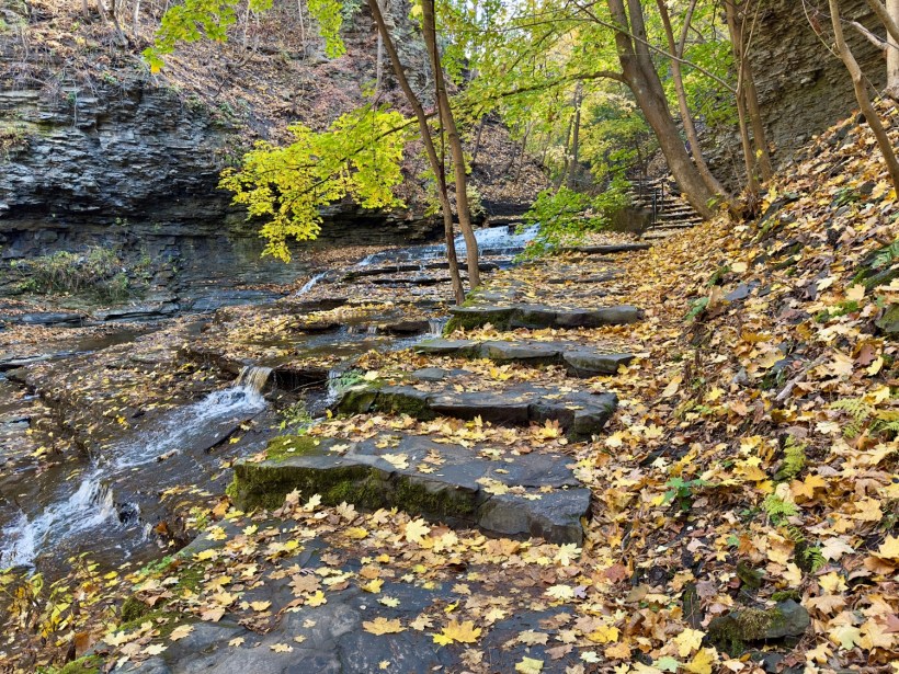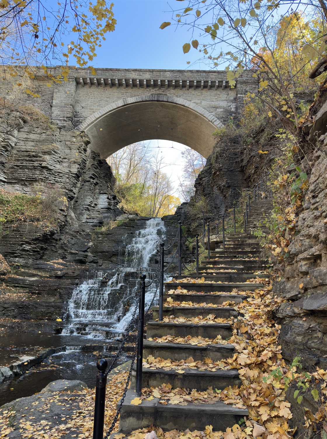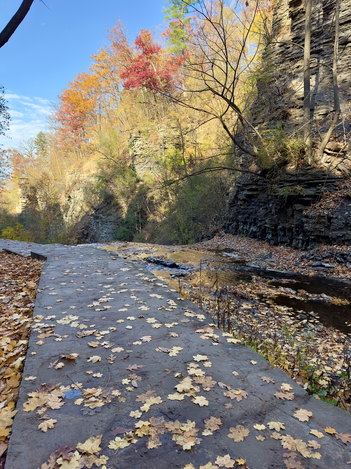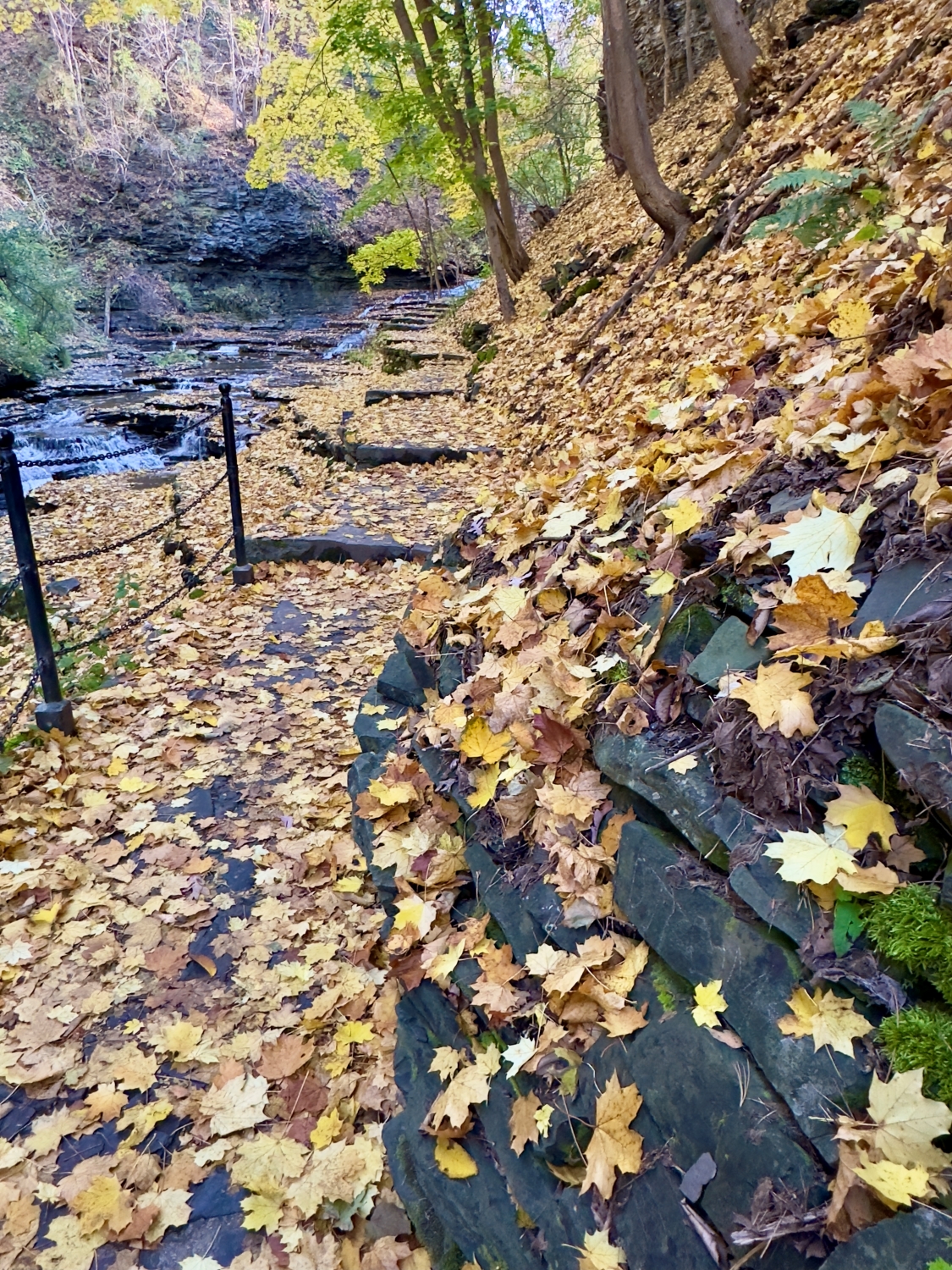 The last stretch of steps is leaf blanketed, their shapes and colors a beautiful final mosaic before I emerge from the shaded coolness of the gorge. The sun filters down through the thinning trees, illuminating the stone buildings of the Cornell campus that peek through the branches ahead. With each step, I feel the transition, moving from the curated wildness of Cascadilla Gorge and its trail to the structured beauty of the university grounds.