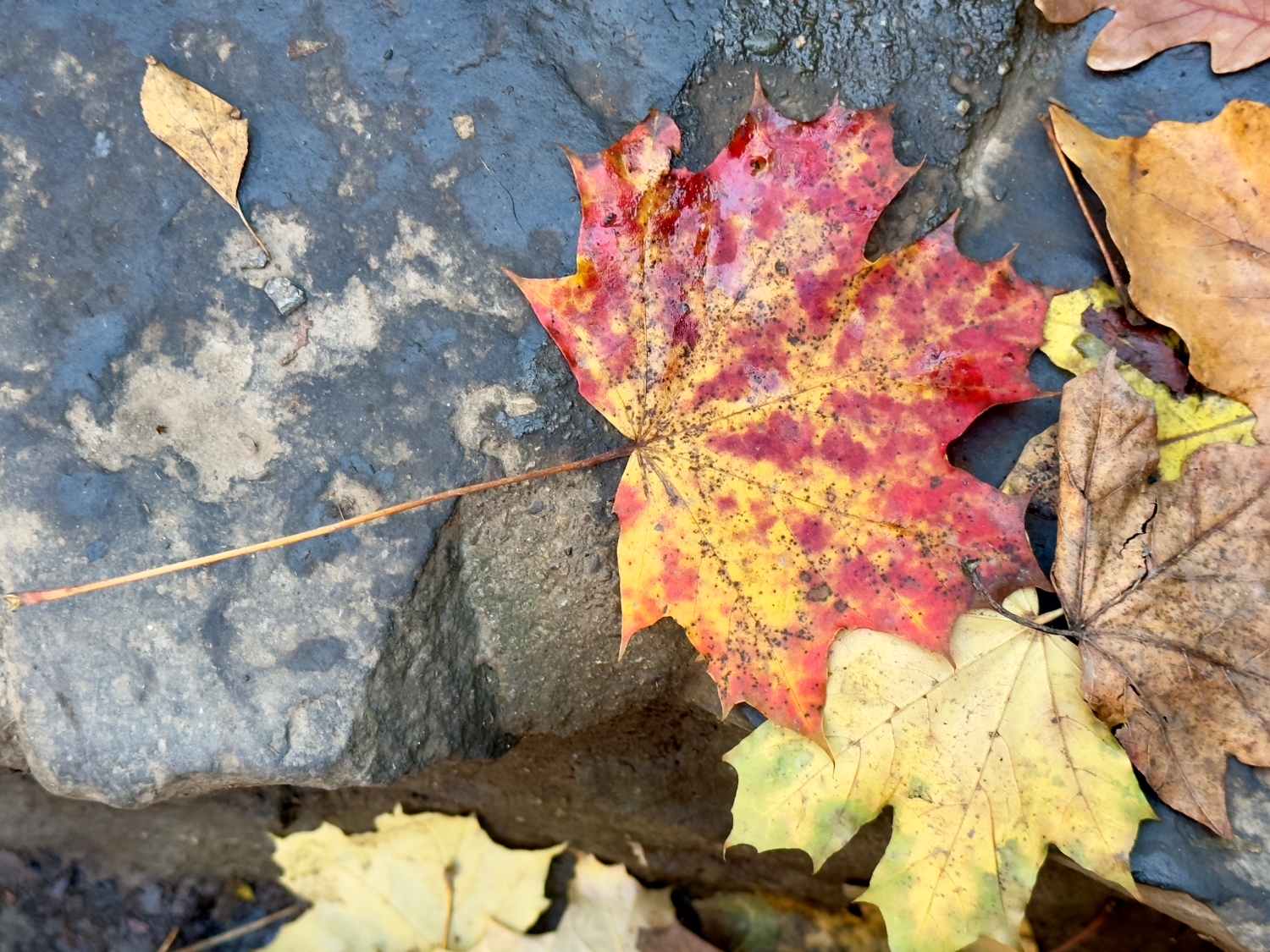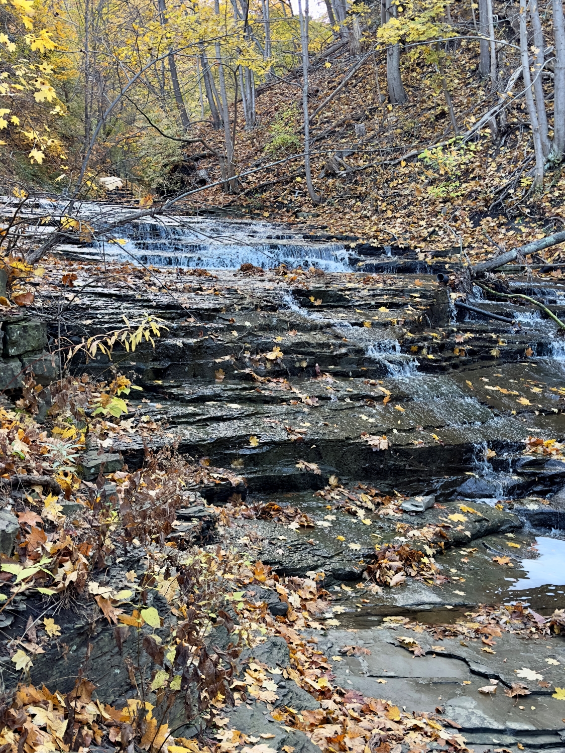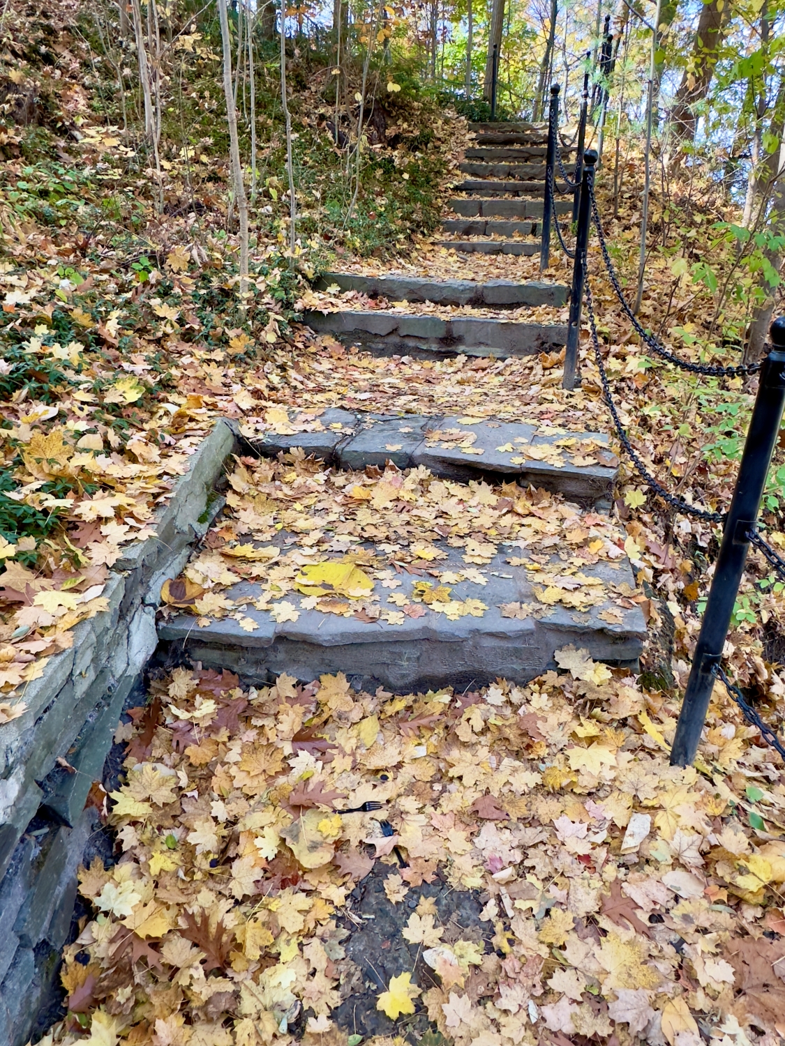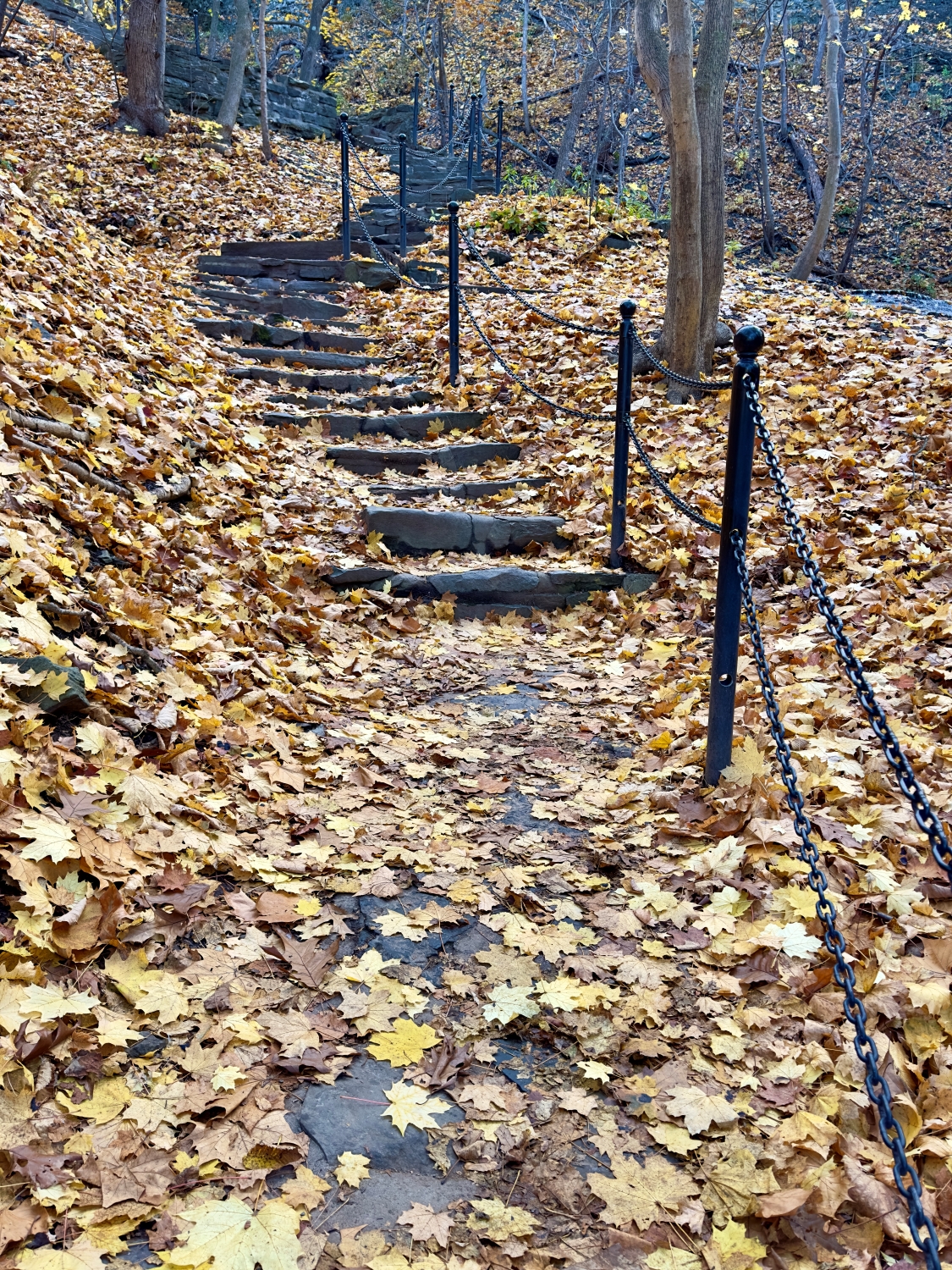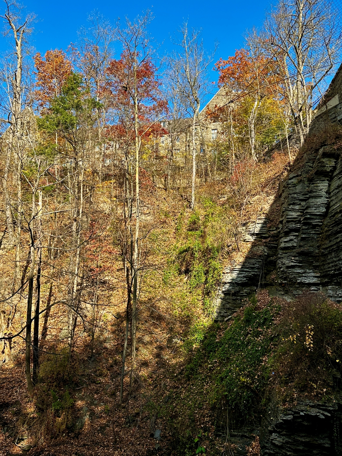 The last stretch of steps is leaf blanketed, their shapes and colors a beautiful final mosaic before I emerge from the shaded coolness of the gorge. The sun filters down through the thinning trees, illuminating the stone buildings of the Cornell campus that peek through the branches ahead. With each step, I feel the transition, moving from the curated wildness of Cascadilla Gorge and its trail to the structured beauty of the university grounds.