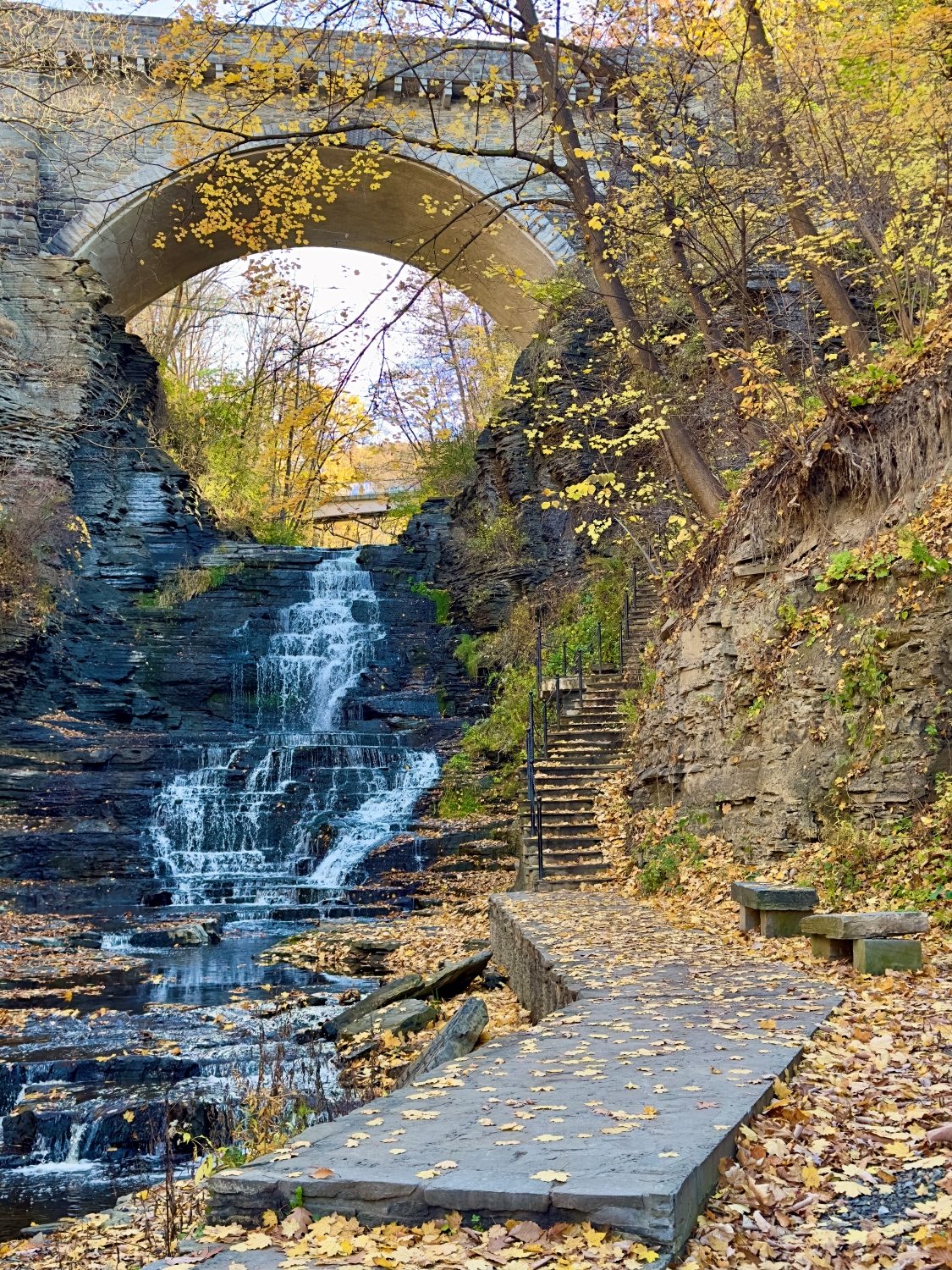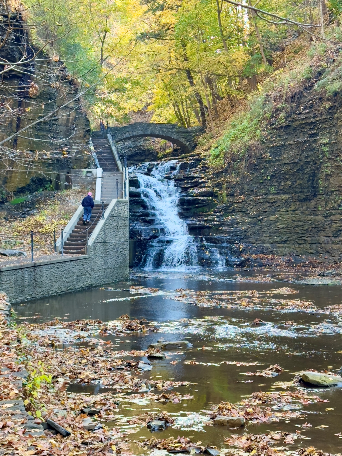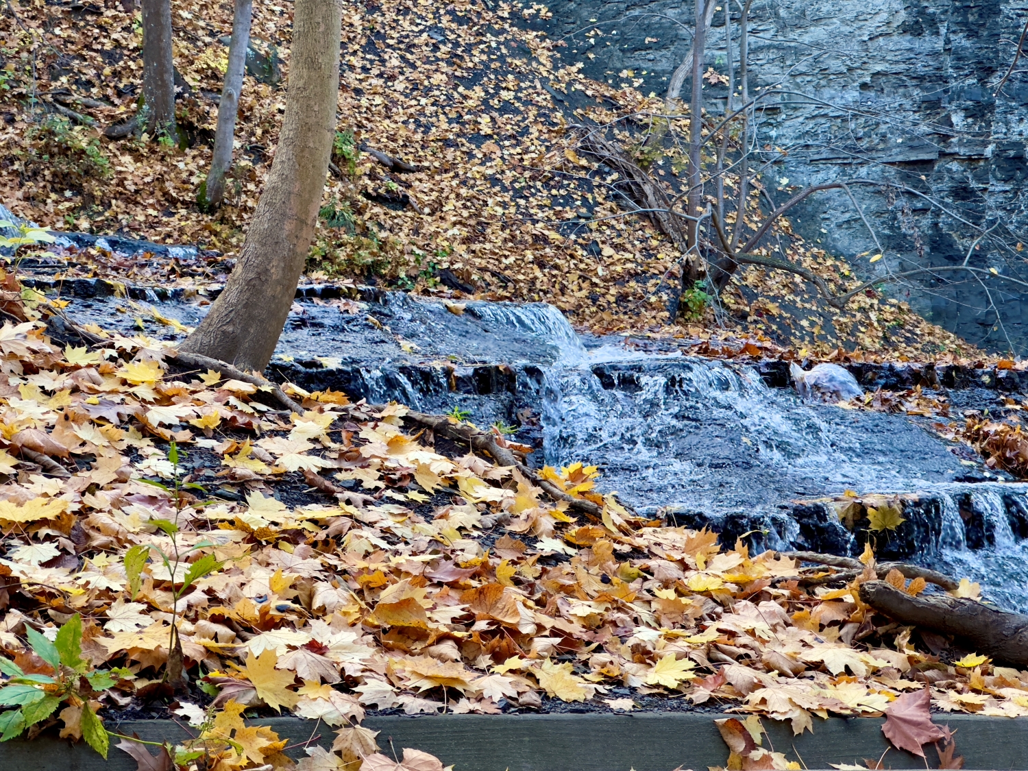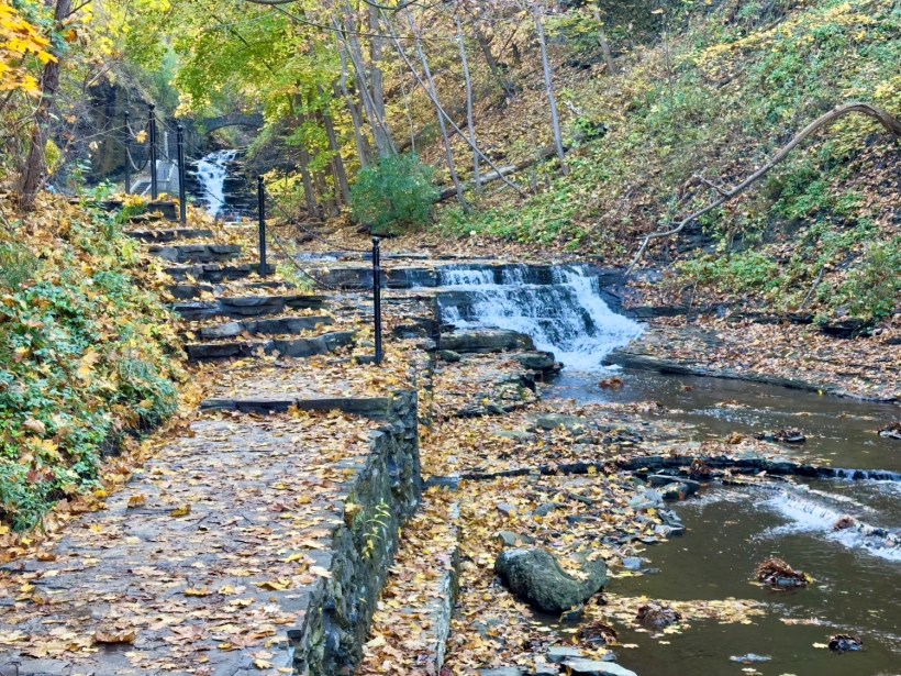 The trail steepens, and I press onward, the sound of the water intensifying as I near a grand waterfall framed by the impressive stone steps leading up to the College Avenue Stone Arch. Each step is littered with leaves, their colors vivid against the worn stone—golds, russets, and the occasional brilliant red, like embers scattered along my path. The waterfall beside me spills down in steady streams, each cascade creating rivulets that catch the light as they flow downward.