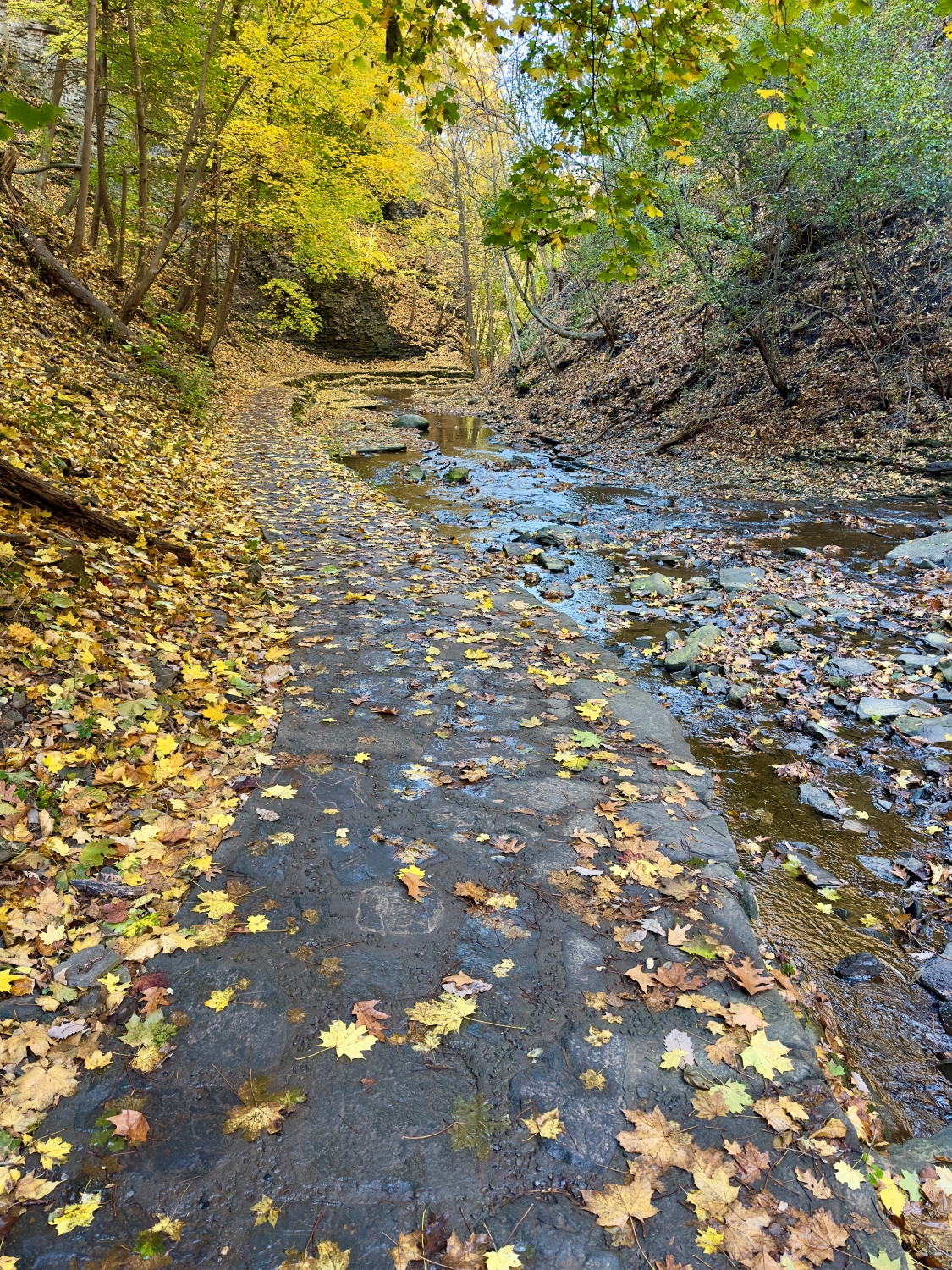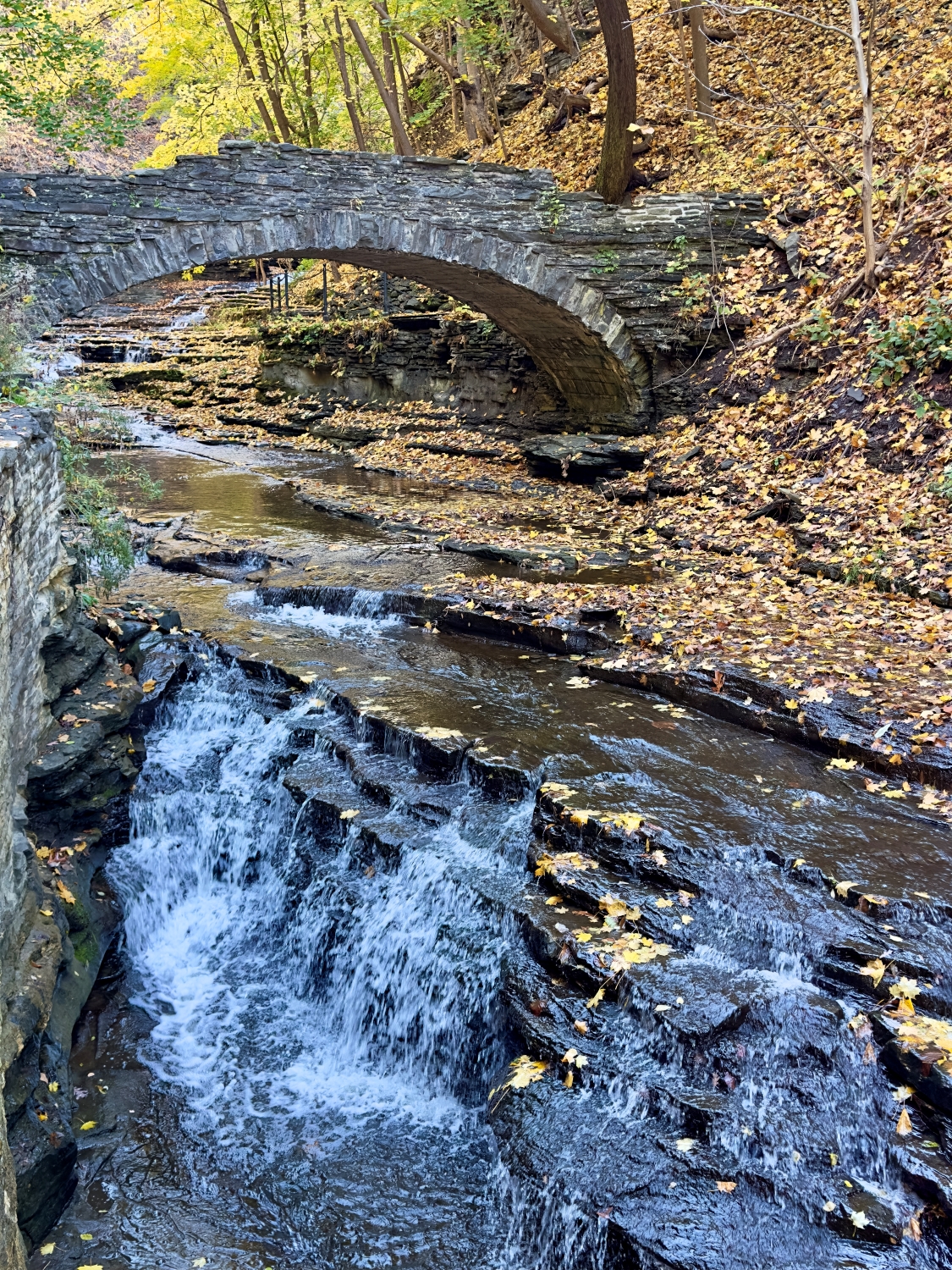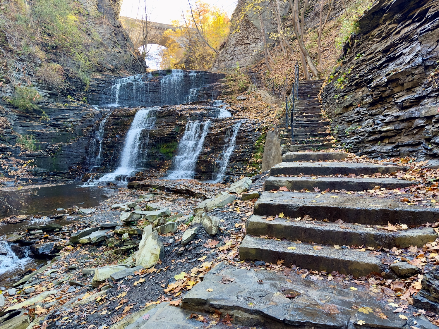 The trail steepens, and I press onward, the sound of the water intensifying as I near a grand waterfall framed by the impressive stone steps leading up to the College Avenue Stone Arch. Each step is littered with leaves, their colors vivid against the worn stone—golds, russets, and the occasional brilliant red, like embers scattered along my path. The waterfall beside me spills down in steady streams, each cascade creating rivulets that catch the light as they flow downward.