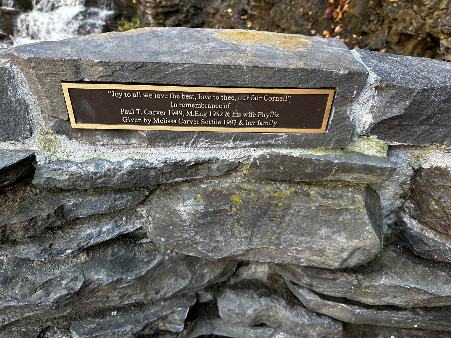 The final ascent is graced by a bench where a stone plaque catches my eye. It’s a tribute, etched with words that resonate in this place: “Joy to all we love the best, love to thee, our fair Cornell.” A gift from a family whose lives intertwined with Cornell, it serves as a reminder of the deep connections people have to this landscape, to the university, and to the memories rooted in these trails and gorges. I pause, reflecting on my own connection to this path, which has taken me through an ever-unfolding tapestry of nature and history.