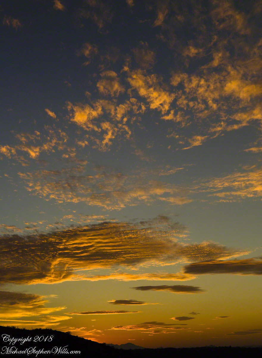 The last push to the saddle is steep, the steps uneven, the sky now a cascade of colors—copper, rose, faint lavender melting into a high dome of blue. The silhouettes of distant ranges sharpen: the Estrellas?, the Superstitions?, low ridges whose names I do not know. On the horizon, the first thin line of sun breaks free, setting fire to the edges of clouds. In another photograph, framed by dark rock and desert trees, that sunrise becomes a golden portal at the end of a shadowed corridor of stone.