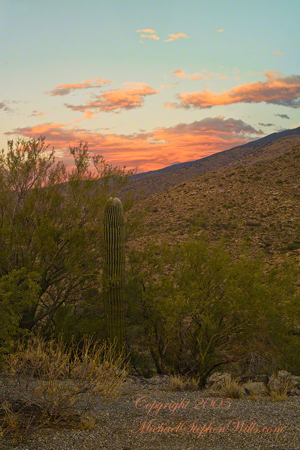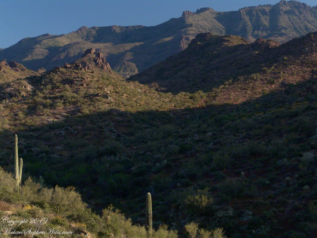 The dark begins to soften at the edges. Over the eastern horizon a thin band of orange appears, a delicate seam between night and day. In one direction, the city stretches out in a glittering net of streetlights, the squares of parking lots and subdivisions catching the last of the darkness. In the other, the mountains are still black cutouts, their profiles sharp as paper against a gradually brightening sky. One of my images will hold that moment: the jagged ridge of Piestewa in shadow, the valley below already spangled with light, a single towering saguaro rooted at the cliff’s edge like a punctuation mark.