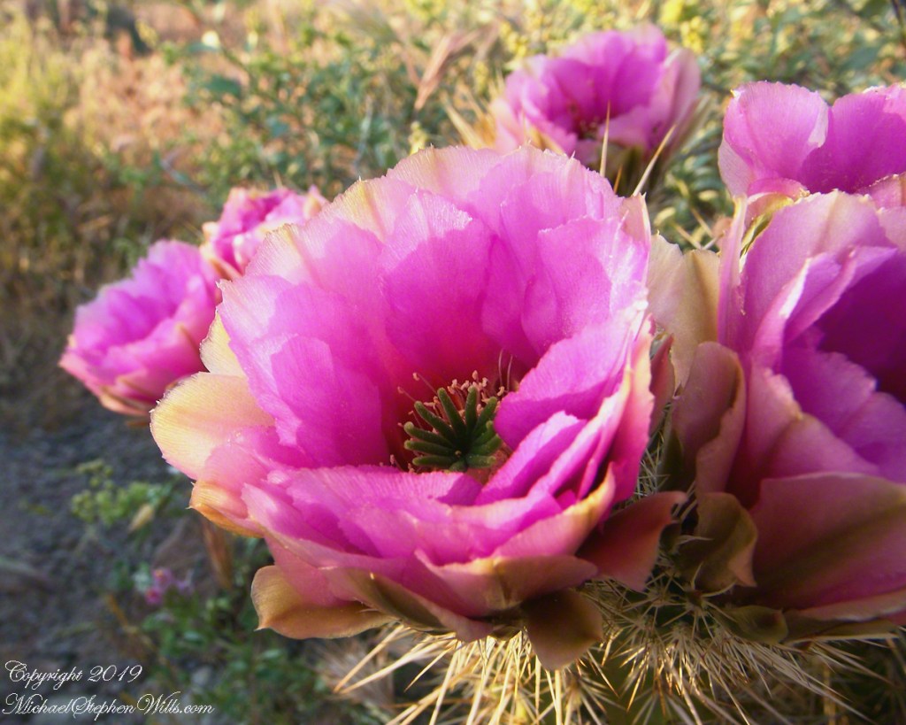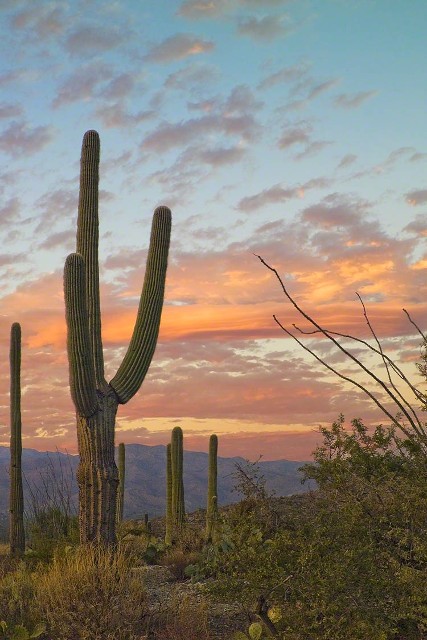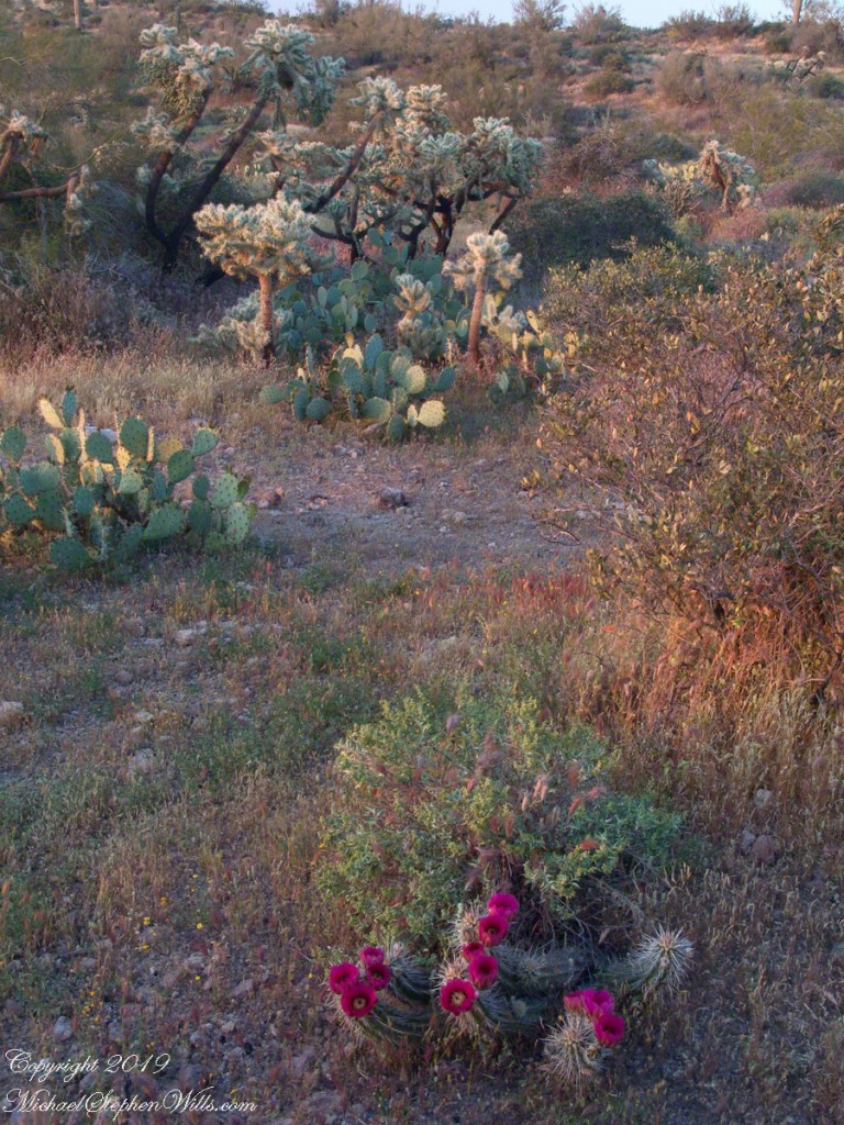 For a few minutes conversation dies away. Everyone seems to feel the same thing: that fragile instant when the sun clears the horizon and the desert shifts from silver-blue to gold. The rocks around us, sharp and broken in the photographs, glow honey-colored. Saguaros catch light on their spines, each thorn a tiny ember. Even the dusty air seems to shimmer.