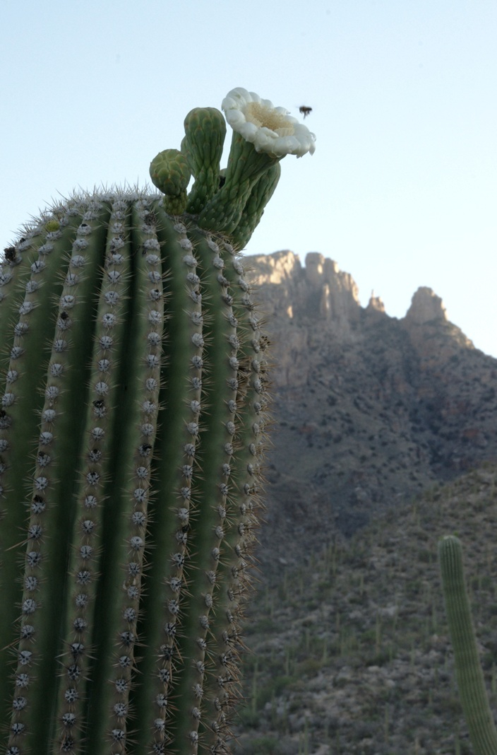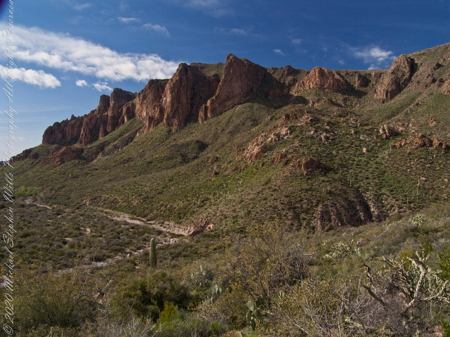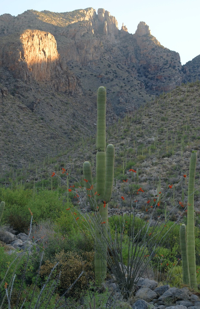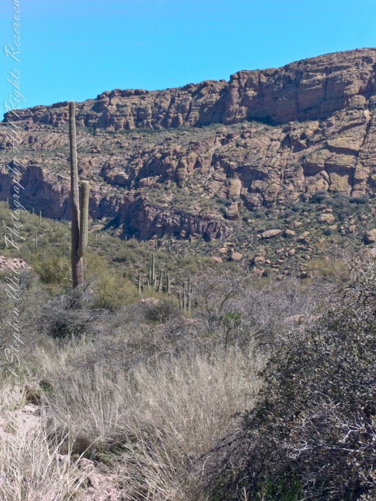 …..and from a portion of the ridge that projects closer to my observation point above the canyon mouth of Reavis Falls. The numerous green poles are young Saguaro cactus. In the distance are mature Saguaros with lateral arms.