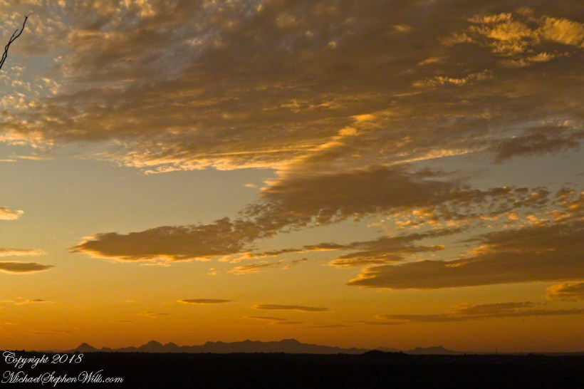 The last push to the saddle is steep, the steps uneven, the sky now a cascade of colors—copper, rose, faint lavender melting into a high dome of blue. The silhouettes of distant ranges sharpen: the Estrellas?, the Superstitions?, low ridges whose names I do not know. On the horizon, the first thin line of sun breaks free, setting fire to the edges of clouds. In another photograph, framed by dark rock and desert trees, that sunrise becomes a golden portal at the end of a shadowed corridor of stone.