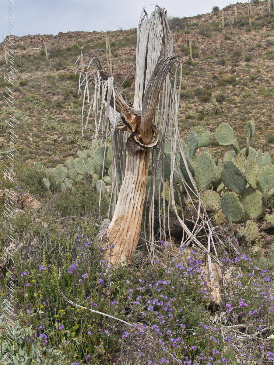 Here we are below the rim of Peter’s Mesa of the Superstition Wilderness. Blue Dicks flourish as the feet of the long-expired giant, the wildflowers grow from corms long used as food by Native Americans. Behind is a large stand of Prickly Pear cactus whose fruit, called tunas, is another food source.