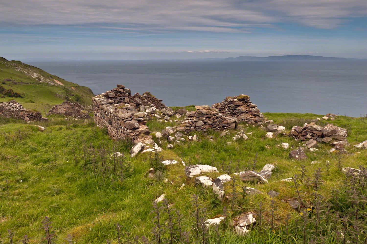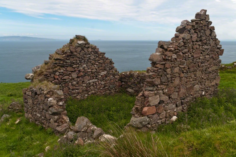 A thick growth of ferns, grass on the gable was once a home with a view of Scotland’s Mull of Kintyre 13 miles across the North Channel of the Irish Sea. The Isle of Sanda just visible on the right of the far gable. A landform named Alisa Crag is just visible in the distance, to the left of the nearest gable.