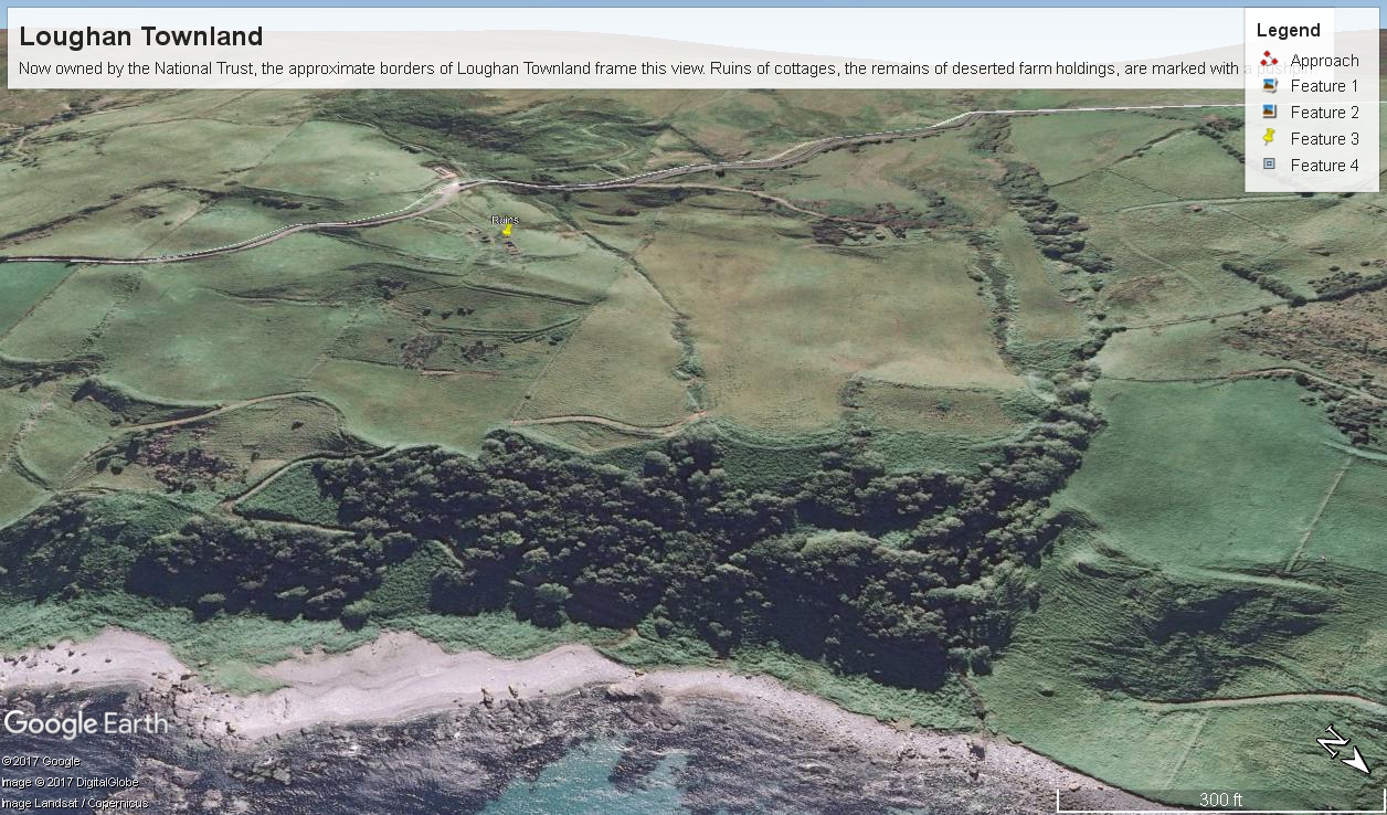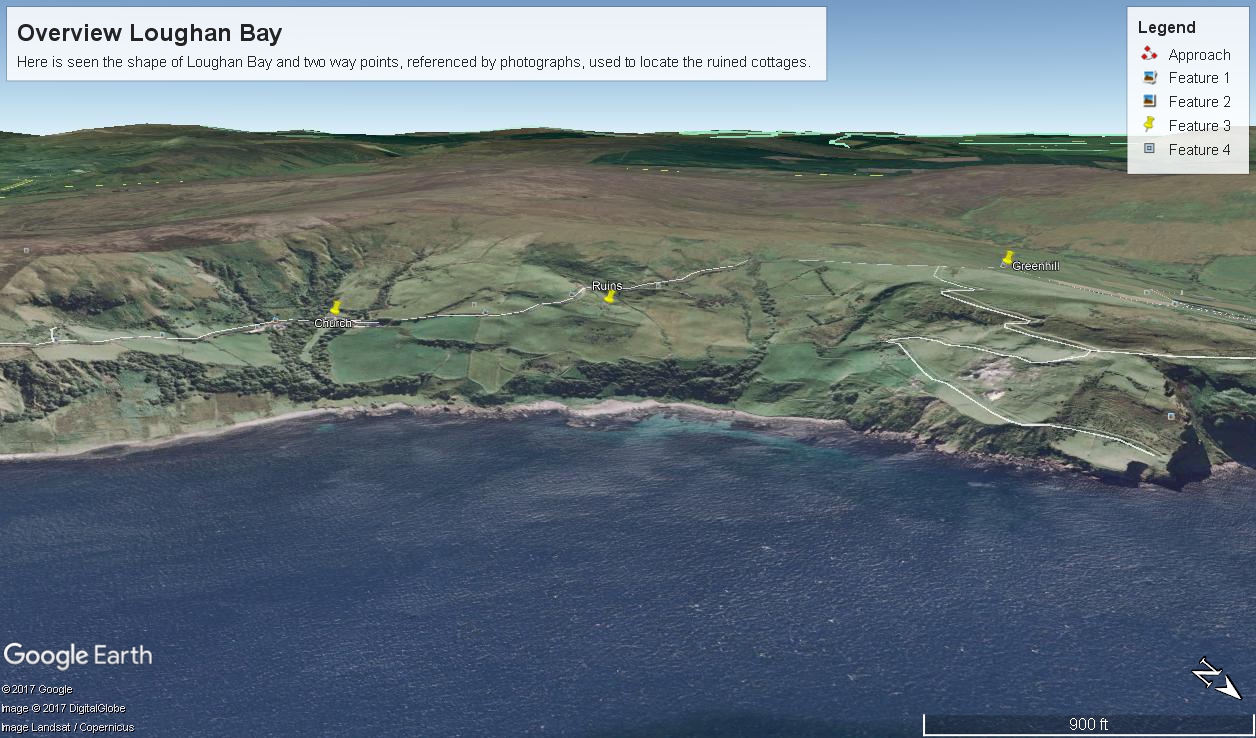 ……a bit further along. It is possible to locate the ruin site from the Google Earth picture. There is a signature grove of bushes on the slope below the ruin site, sandy beach along shore. In the landscapes, Loughan Bay is cradled in a curve of coast.