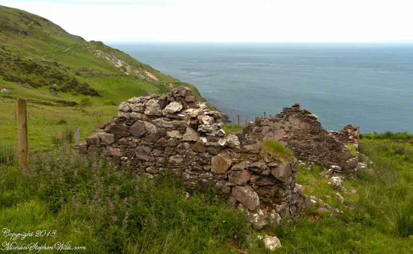 This much I knew, going in: we were touring Antrim Glens entering at Cushendall, after visiting Glenariff Forest Park, proceeding up the coast through Cushendun to Torr Head. A fortuitous encounter with a village of abandoned farm cottages (“ruins”) happened somewhere in between.