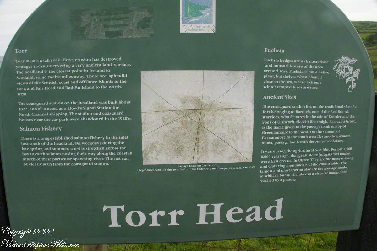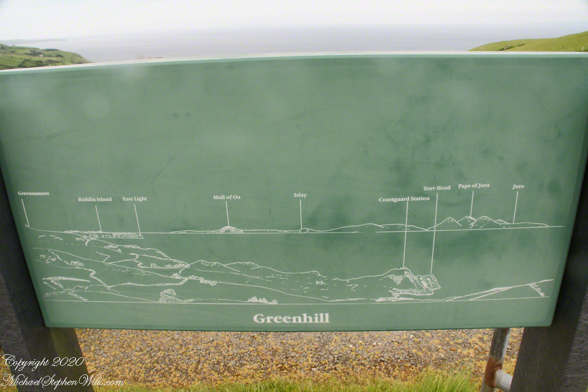 The view of the placard, to the north, starting left, Greenanmore is a height on Ireland, the site of a prehistoric passage tomb. Rathlin Island (with the East Light) is Ireland as well. Mull of Oa is on the Scottish island of Islay. A “mull” in Scotland is the same as a “head” or “point”. It turns out, the closest point of Scotland is the Mull of Kintyre, 12.4 miles across North Channel, is to the east. Islay is 27.4 miles north.