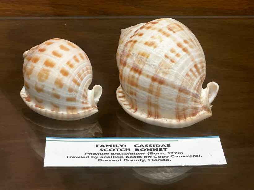 Fascinated by my find, I visited the Brevard County Museum of Natural History later that day. There, I learned that the Scotch Bonnet is more than just a pretty shell—it’s the former home of a gastropod, a creature that once crawled along the ocean floor of the Atlantic, from North Carolina to Brazil. These mollusks begin life as tiny larvae, floating in the currents until they grow large enough to settle on the seabed. They feast on sea stars, their radula—a toothy tongue—scraping their prey into digestible pieces.