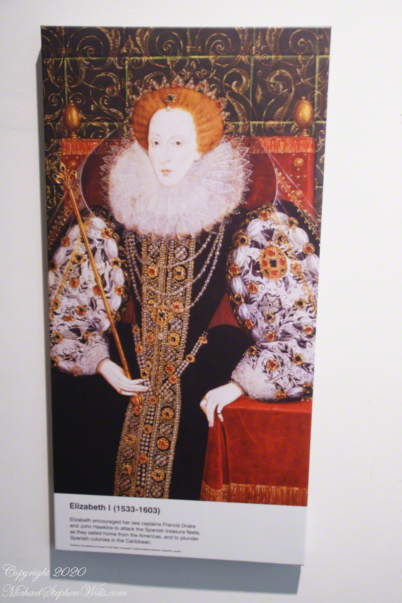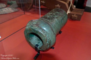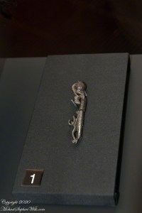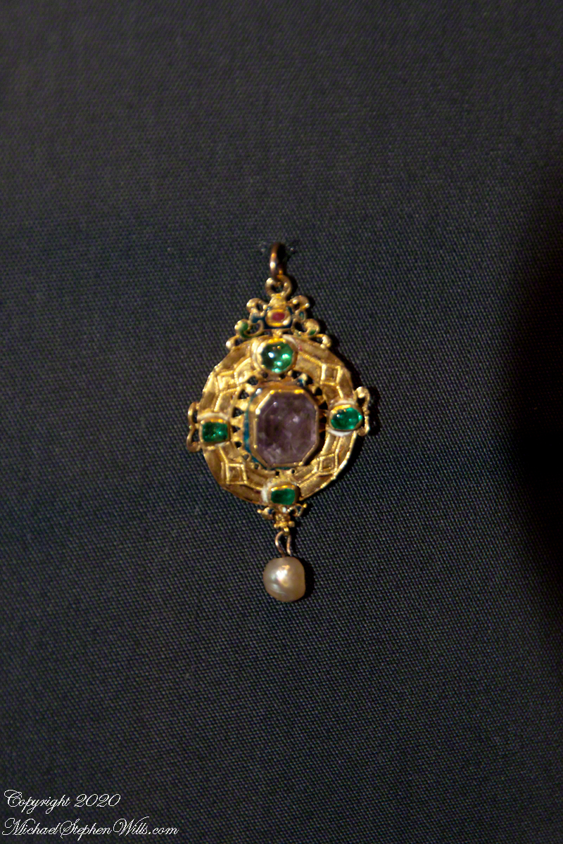 (from the Museum Placard) The jewel in the following photograph epitomizes the wealth and outreach of the Spanish Empire in the late sixteenth century and has become an icon for the Armada. Just three of the original nine rubies survive. The jewel takes the form of an exotic animal, either a real Mexican salamander or a mythical creature, and reflects the great importance of the gold and silver brought from the colonies. The gold came from South America, with the rubies probably came from Burma. In legend, the salamander had the twin magical properties of being able to both extinguish and survive fire. This made it a powerful good luck charm on a wooden fighting ship, where fire was one of the greatest dangers.