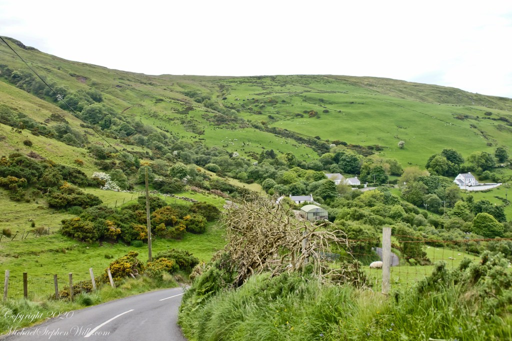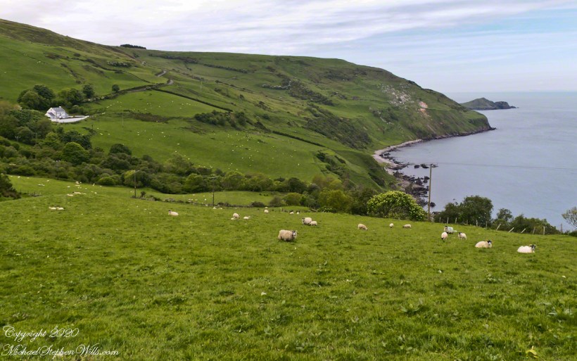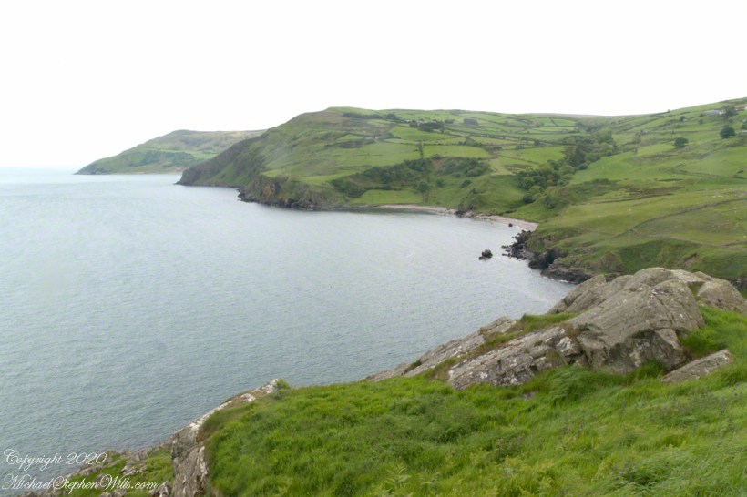 Tor in Irish is a steep rocky height. Likewise, Corr means odd, uneven, rounder, convex, curved, peaked, projecting, smooth. Combined Torcorr is the townland where we stopped on the Torr Road, halted by our wonder at this sight. In the distance, Torr Head projects into North Channel, the closest land to Scotland. Following the coast, the cliffs in front of Torr Head is home to numerous sea birds. The curved bay is named Loughan, the rocky sand beach are ruins of cottages emptied by Irish emigration. The white building is Saint Mary’s Star of the Sea Roman Catholic Church. County Antrim, Northern Ireland.View of Coolranny townland with Saint Mary’s Star of the Sean Roman Catholic Church from Torcorr townland, Torr Road . County Antrim, Northern Ireland.On the way to Torr Head we stopped at this spot in Coolranny Townland to take in this view of the Irish Sea. The land overlooks Loughan Bay toward the Mull of Kintyre and Sanda Island, Scotland. County Antrim, Northern Ireland.