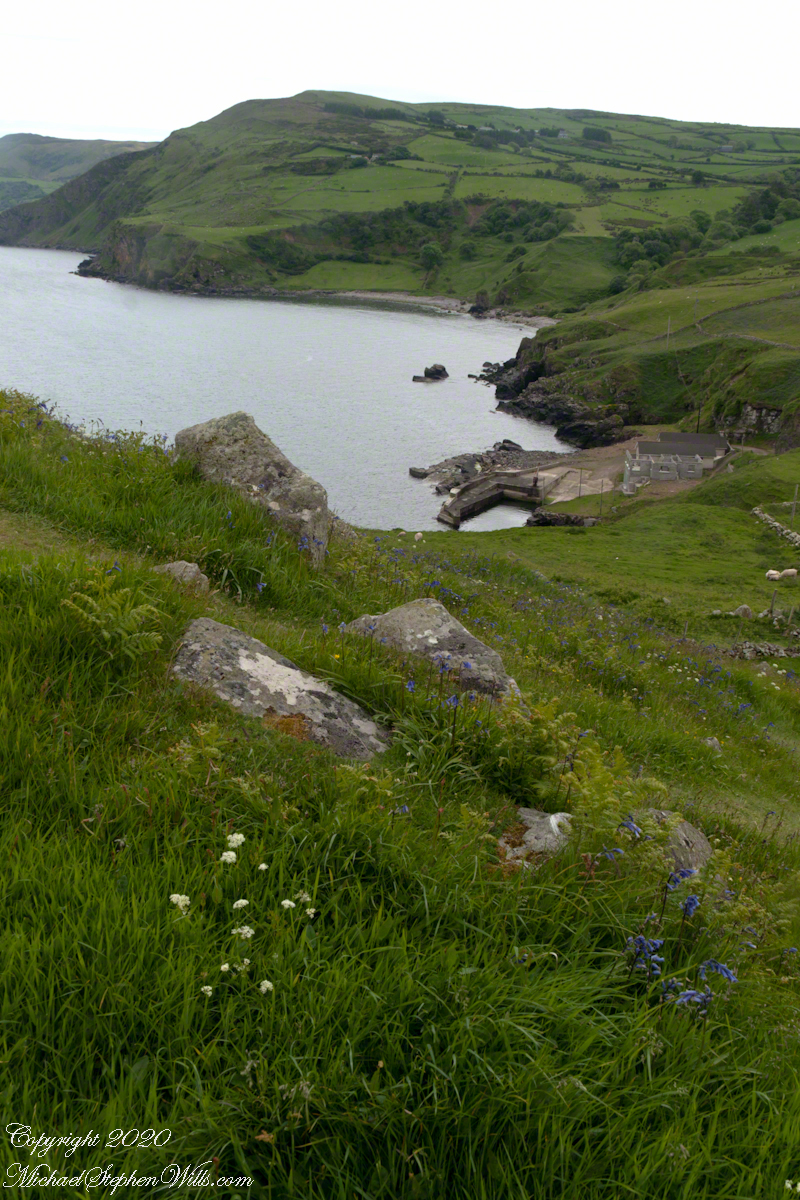 The small harbor seen here from Torr Head is for the salmon fishery. Small boats will seek shelter here from the wind and tides strong enough to roar in passing the Head, like a fast flowing river.