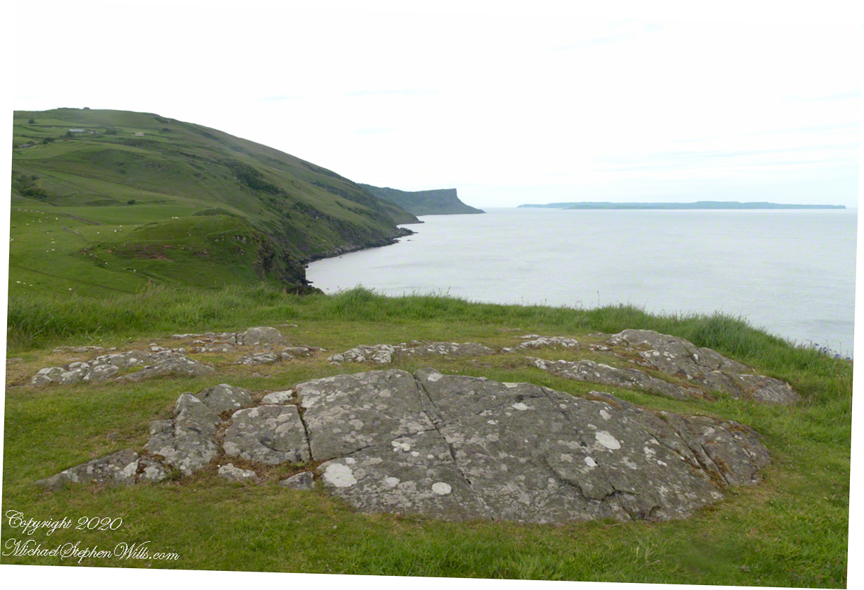When I enlarge the original photograph, visible on the ridge is a decommissioned Cold War listening post, the tomb is near that. The distant land across the North Channel water is Rathlin Island.