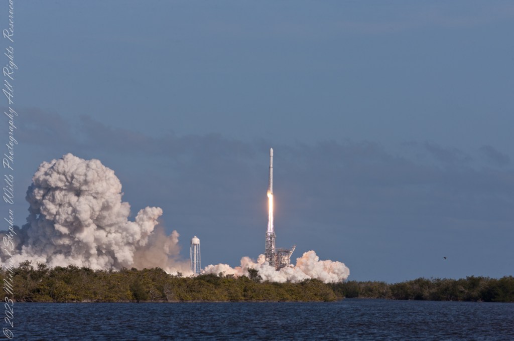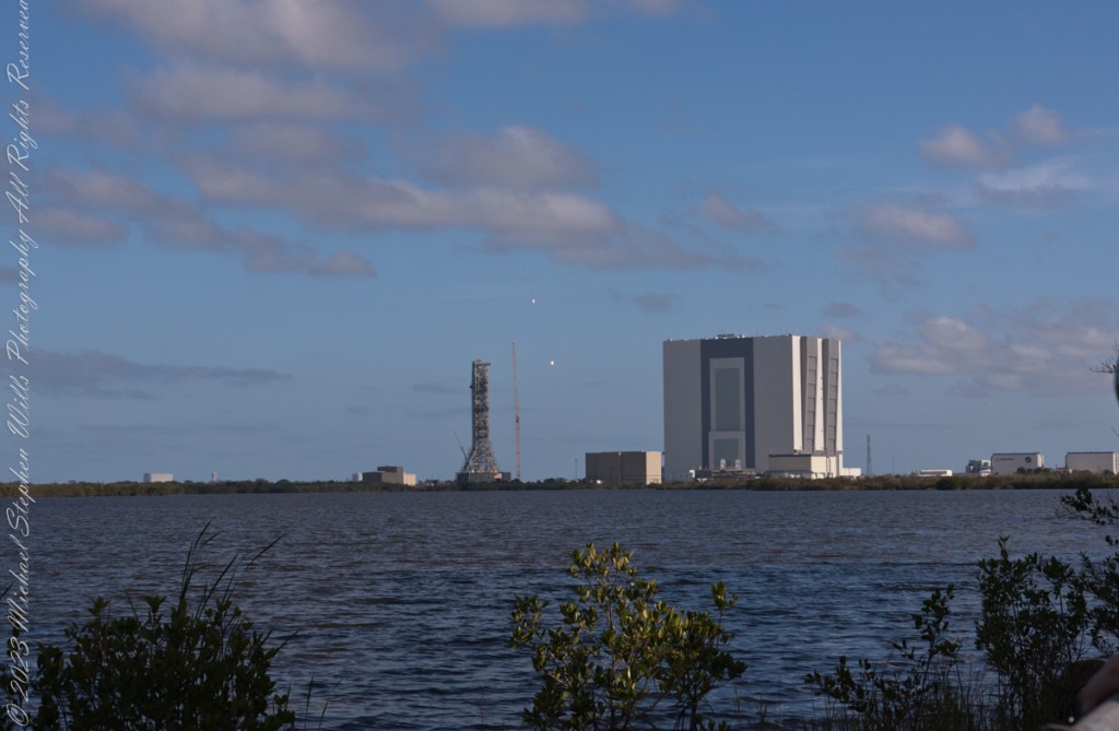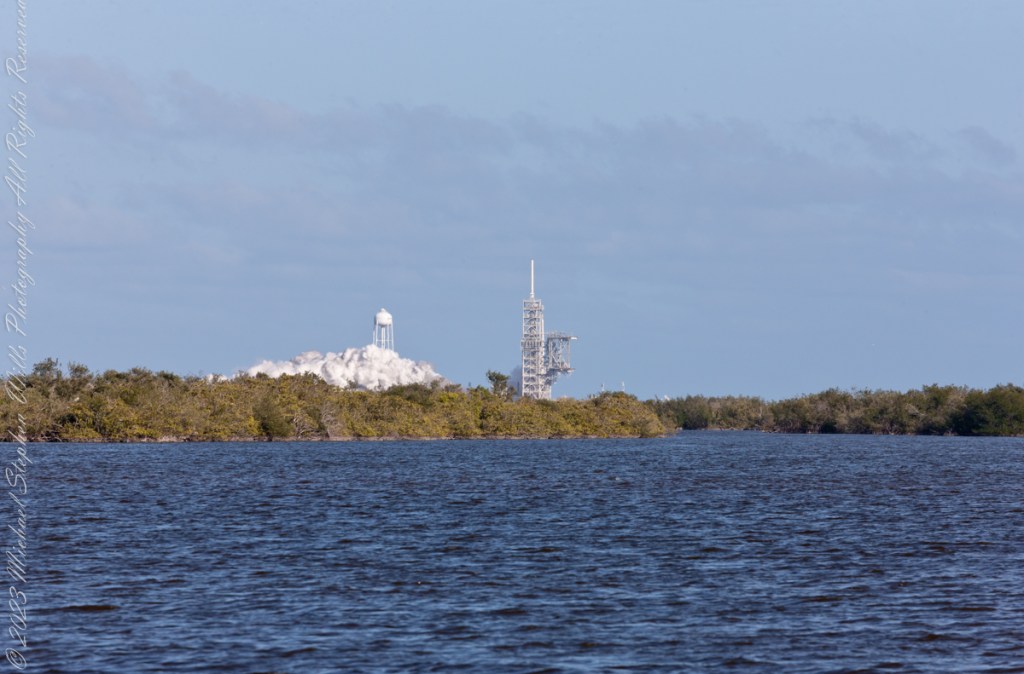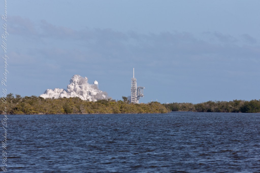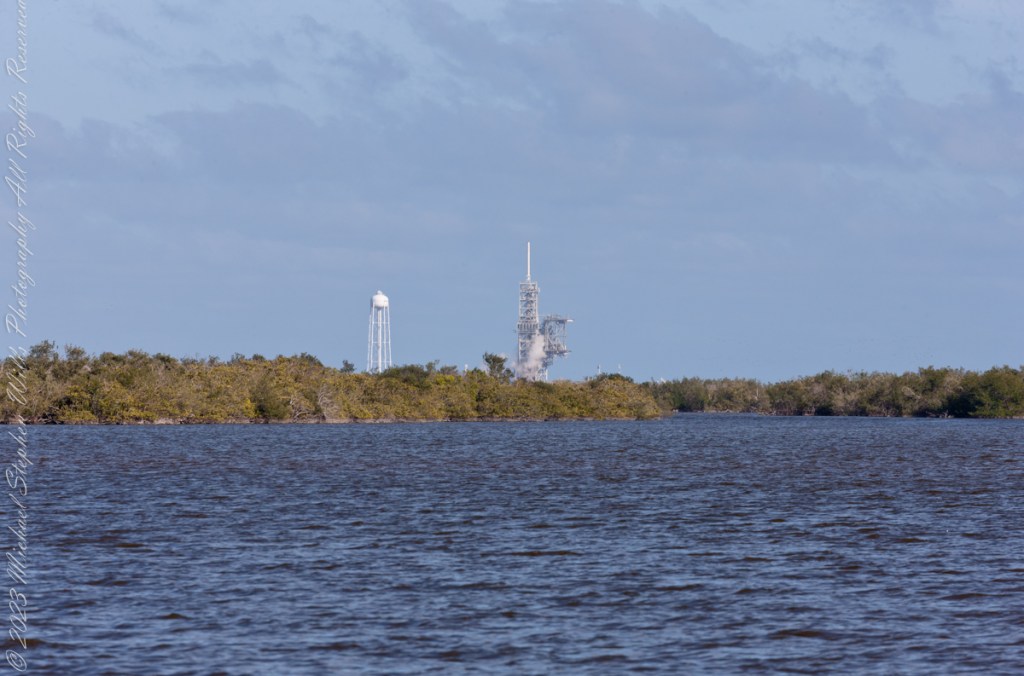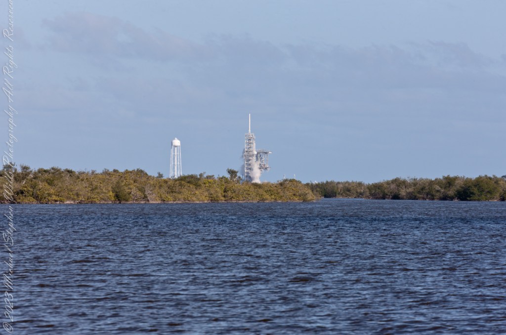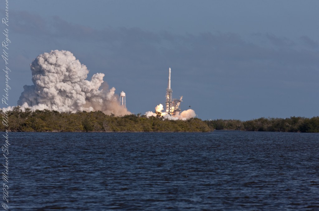 February 6, 2018 fuel venting during fueling of the Space X Falcon Heavy 19 minutes 25 seconds prior to launch. The rocket hidden by the launch tower. Taken from Kennedy Space Center Apollo-Saturn V Center looking across the Banana River to Launch Complex 39A, 3.9 miles away.Pam and Mike Wills in place at a prime spot for the SpaceX Falcon Heavy Launch. Kennedy Space Center, Apollo-Saturn V Center. February 6, 2018. 00:10:49 before launch.February 6, 2018 fuel venting, fueling complete 1 minute 20 seconds prior to launch. The rocket hidden by the launch tower. Taken from Kennedy Space Center Apollo-Saturn V Center looking across the Banana River to Launch Complex 39A, 3.9 miles away.February 6, 2018 Space X Falcon Heavy, 3 seconds prior to launch. The rocket hidden by the launch tower. The cloud is water released into the launch platform under pressure from the water tower. Taken from Kennedy Space Center Apollo-Saturn V Center looking across the Banana River to Launch Complex 39A, 3.9 miles away.February 6, 2018 Space X Falcon Heavy, launch 2 seconds prior to launch. The rocket hidden by the launch tower. The cloud is water released into the launch platform under pressure from the water tower. Taken from Kennedy Space Center Apollo-Saturn V Center loking across the Banana River to Launch Complex 39A, 3.9 miles away.February 6, 2018 Space X Falcon Heavy engine ignition. The moment of engine ignition, the rocket hidden by the launch tower. Taken from Kennedy Space Center Apollo-Saturn V Center loking across the Banana River to Launch Complex 39A, 3.9 miles away.February 6, 2018 Space X Falcon Heavy, launch plus 1 second. Ignition visible, tower connections falling away. Rocket nose visible to right of tower lightening rod. Taken from Kennedy Space Center Apollo-Saturn V Center loking across the Banana River to Launch Complex 39A, 3.9 miles away.February 6, 2018 Space X Falcon Heavy, launch plus 2 seconds. Rocket lift-off fully underway. Taken from Kennedy Space Center Apollo-Saturn V Center looking across the Banana River to Launch Complex 39A, 3.9 miles away.February 6, 2018 Space X Falcon Heavy, launch plus 4 seconds. Rocket not yet clear of launch tower. Taken from Kennedy Space Center Apollo-Saturn V Center looking across the Banana River to Launch Complex 39A, 3.9 miles away.February 6, 2018 Space X Falcon Heavy, launch plus 5 seconds. A heron flies to the right of launch tower. Taken from Kennedy Space Center Apollo-Saturn V Center looking across the Banana River to Launch Complex 39A, 3.9 miles away.February 6, 2018 Space X Falcon Heavy, launch plus 6 seconds. Rocket is just clear of launch tower. At 230 feet in 6 seconds it is travelling at 26.1 miles per hour. A heron flies to right of launch tower. Taken from Kennedy Space Center Apollo-Saturn V Center looking across the Banana River to Launch Complex 39A, 3.9 miles away.February 6, 2018 Space X Falcon Heavy, launch plus 7 seconds. Rocket is clear of the launch tower. Taken from Kennedy Space Center Apollo-Saturn V Center looking across the Banana River to Launch Complex 39A, 3.9 miles away.February 6, 2018 Space X Falcon Heavy, launch plus 7 seconds. Taken from Kennedy Space Center Apollo-Saturn V Center looking across the Banana River to Launch Complex 39A, 3.9 miles away.February 6, 2018 Space X Falcon Heavy, launch plus 8 seconds. Taken from Kennedy Space Center Apollo-Saturn V Center looking across the Banana River to Launch Complex 39A, 3.9 miles away.February 6, 2018 Space X Falcon Heavy, launch plus 9 seconds. Taken from Kennedy Space Center Apollo-Saturn V Center looking across the Banana River to Launch Complex 39A, 3.9 miles away.February 6, 2018 Space X Falcon Heavy, launch plus 12 seconds. Taken from Kennedy Space Center Apollo-Saturn V Center.February 6, 2018 Space X Falcon Heavy, launch plus 20 seconds. The rocket has rolled a few degrees, all boosters are visible. The Taken from Kennedy Space Center Apollo-Saturn V Center.February 6, 2018 Space X Falcon Heavy, launch plus 25 seconds. All boosters are visible. Taken from Kennedy Space Center Apollo-Saturn V Center.February 6, 2018 Space X Falcon Heavy, launch plus 26 seconds. All boosters are visible. Taken from Kennedy Space Center Apollo-Saturn V Center.February 6, 2018 Space X Falcon Heavy, launch plus 32 seconds. A boosters are visible. Taken from Kennedy Space Center Apollo-Saturn V Center.February 6, 2018 Space X Falcon Heavy, launch plus 1 minute 11 seconds. The boosters have throttled back. Taken from Kennedy Space Center Apollo-Saturn V Center.February 6, 2018 Space X Falcon Heavy, launch plus 1 minute 57 seconds. The cloud was formed from the throttled back boosters. The rocket is visible near center of frame. Taken from Kennedy Space Center Apollo-Saturn V Center.February 6, 2018 Space X Falcon Heavy, launch plus 6 minutes 37 seconds. Firing thrusterrs of the two returning boosters are visible a bit above the center of frame. Taken from Kennedy Space Center Apollo-Saturn V Center.February 6, 2018 Space X Falcon Heavy, launch plus 7 minutes 50 seconds. Both boosters visible firing thrusters between the SLS Launch Tower and NASA Vehicle Assembly Building. Taken from Kennedy Space Center Apollo-Saturn V Center loking across the Banana River.February 6, 2018 Space X Falcon Heavy, launch plus 8 minutes 2 seconds. Both boosters visible firing thrusters between the SLS Launch Tower and NASA Vehicle Assembly Building. Taken from Kennedy Space Center Apollo-Saturn V Center loking across the Banana River.February 6, 2018 Space X Falcon Heavy, launch plus 8 minutes 3 seconds. Both boosters visible firing thrusters between the SLS Launch Tower and NASA Vehicle Assembly Building. Taken from Kennedy Space Center Apollo-Saturn V Center loking across the Banana River.